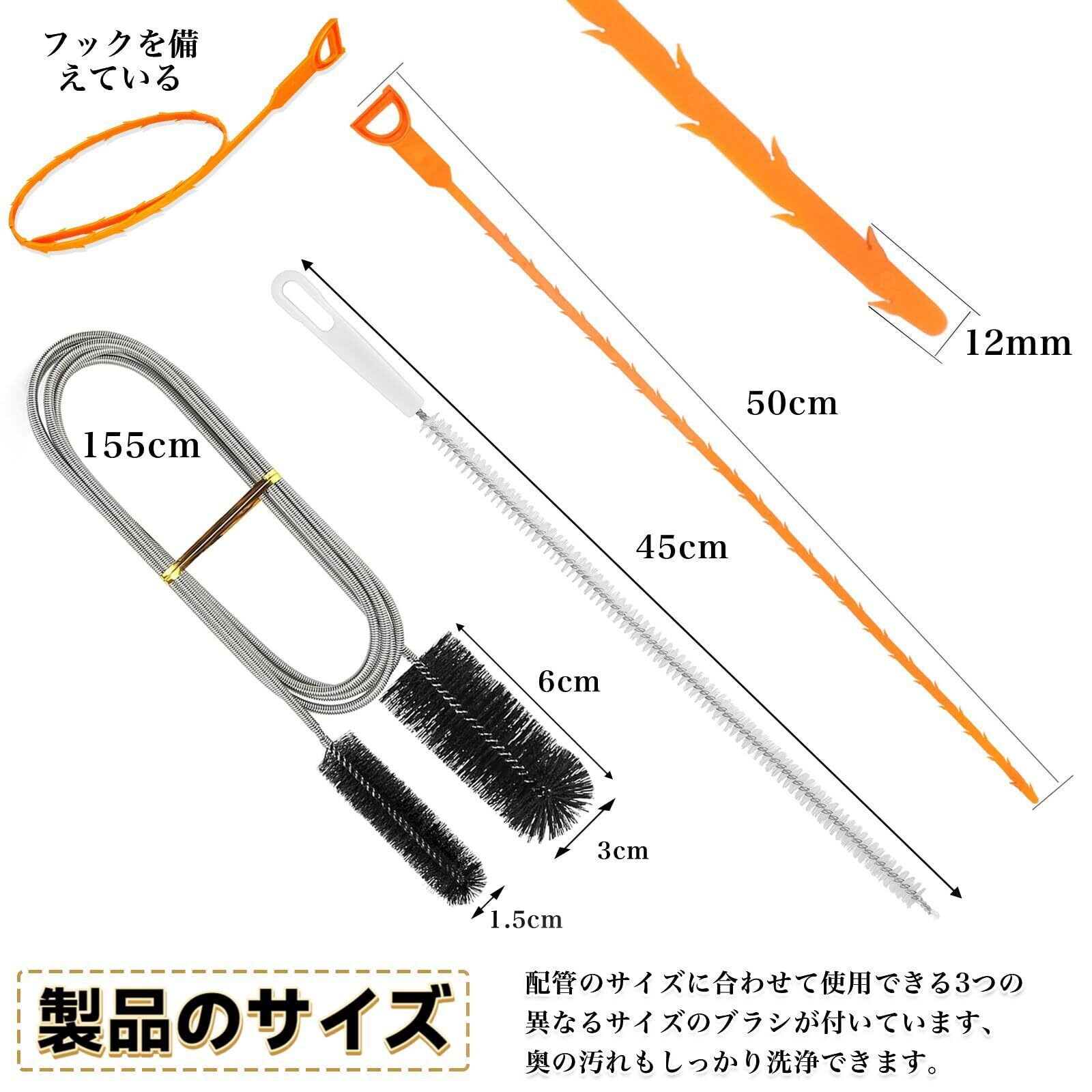 【使いやすさ】3個のパイプブラシは、より便利に使用できます。配管のサイズに合わせて使用できる3つの異なるサイズのブラシが付いています、奥の汚れもしっかり洗浄できます。45cmのブラシ、50cmのクリーニングフック、そして155cmの両端ブラシです(ブラシの毛の長さは6cm、直径は1.5cmと3cm)。
