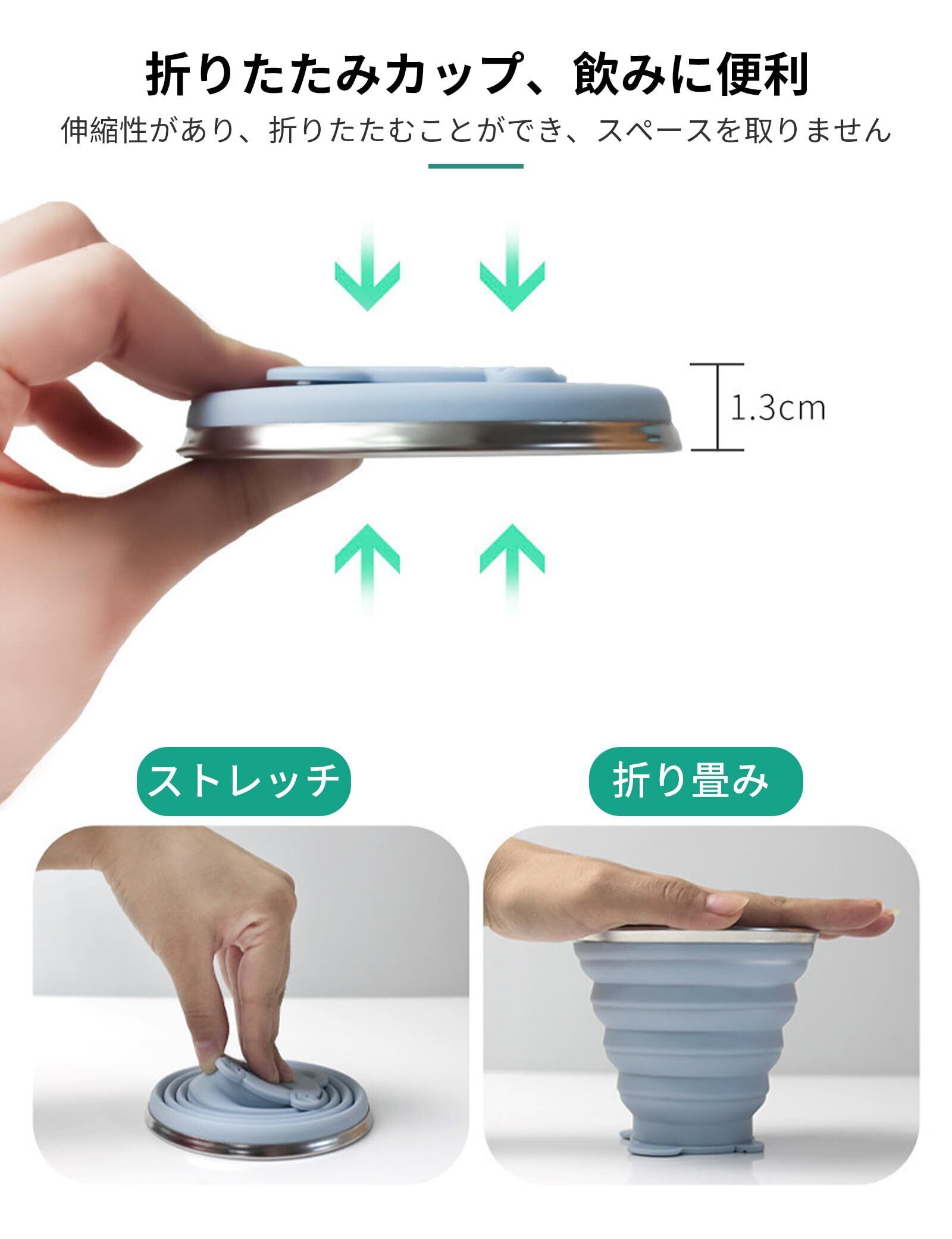 【高品質素材】: 当社の折りたたみ式カップは食品グレードのシリコンで作られており、安全で耐久性があります。 妊婦や子供にも安全に使用でき、環境に優しく、長期間の使用に耐えます。 お手入れも簡単なので、普段使いにぴったりです。 【高温・低温耐性】:このカップは200度までの高温と-40度の低温に耐えることができます。 温かいコーヒーも冷たい飲み物も安心してお楽しみいただけます。 カップの柔軟性により、熱い飲み物を注ぐときに手が火傷することがありません。 ▶ご注意:1. 熱湯を入れるときは、火傷を防ぐため、入れすぎないでください。2.シリコン素材は柔らかいので、水が飛び散る恐れがありますので、カップ本体を強く持たないでください。 【密閉・漏れ防止】: 特別に設計された気密蓋が漏れを防ぎ、飲み物を新鮮に保ちます。 液漏れや粉塵の混入を心配する必要はありません。 【持ち運びが簡単】:コンパクトで軽量なので、折りたたんでポケットやバッグに収納できます。 ストラップのデザインも持ち運びに便利です。 旅行、出張、ピクニックなど様々なシーンで活躍します。 【多機能】:このカップはアウトドア、キャンプ、ピクニック、出張、サイクリング、釣り、登山、フィットネス、ヨガなど様々なシーンで活用できます。 ペットの水入れとしても使用できるので、外出先でもペットに簡単に水分補給ができます。 自宅でもオフィスでも使いやすいです。