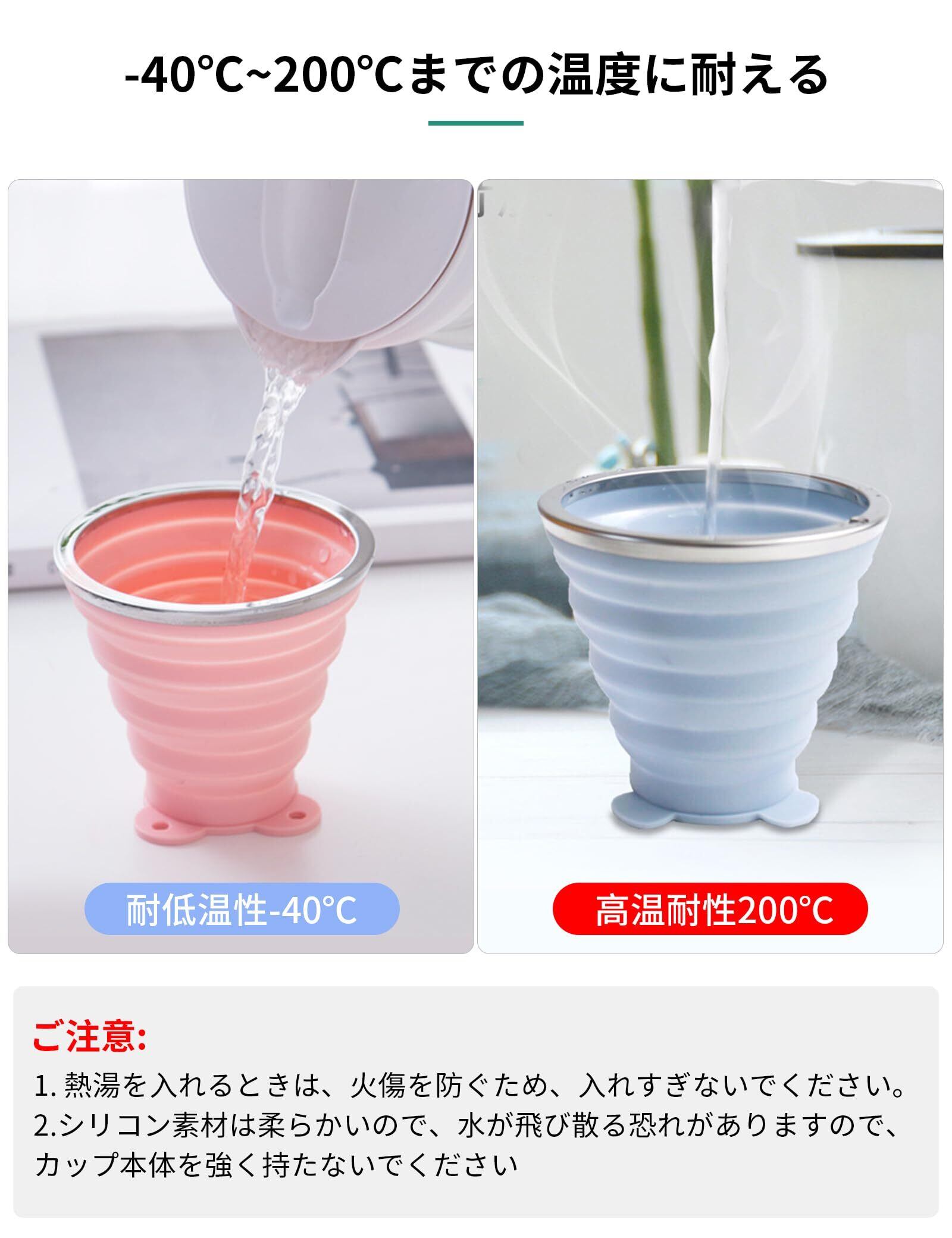 【高温・低温耐性】:このカップは200度までの高温と-40度の低温に耐えることができます。 温かいコーヒーも冷たい飲み物も安心してお楽しみいただけます。 カップの柔軟性により、熱い飲み物を注ぐときに手が火傷することがありません。 ▶ご注意:1. 熱湯を入れるときは、火傷を防ぐため、入れすぎないでください。2.シリコン素材は柔らかいので、水が飛び散る恐れがありますので、カップ本体を強く持たないでください。