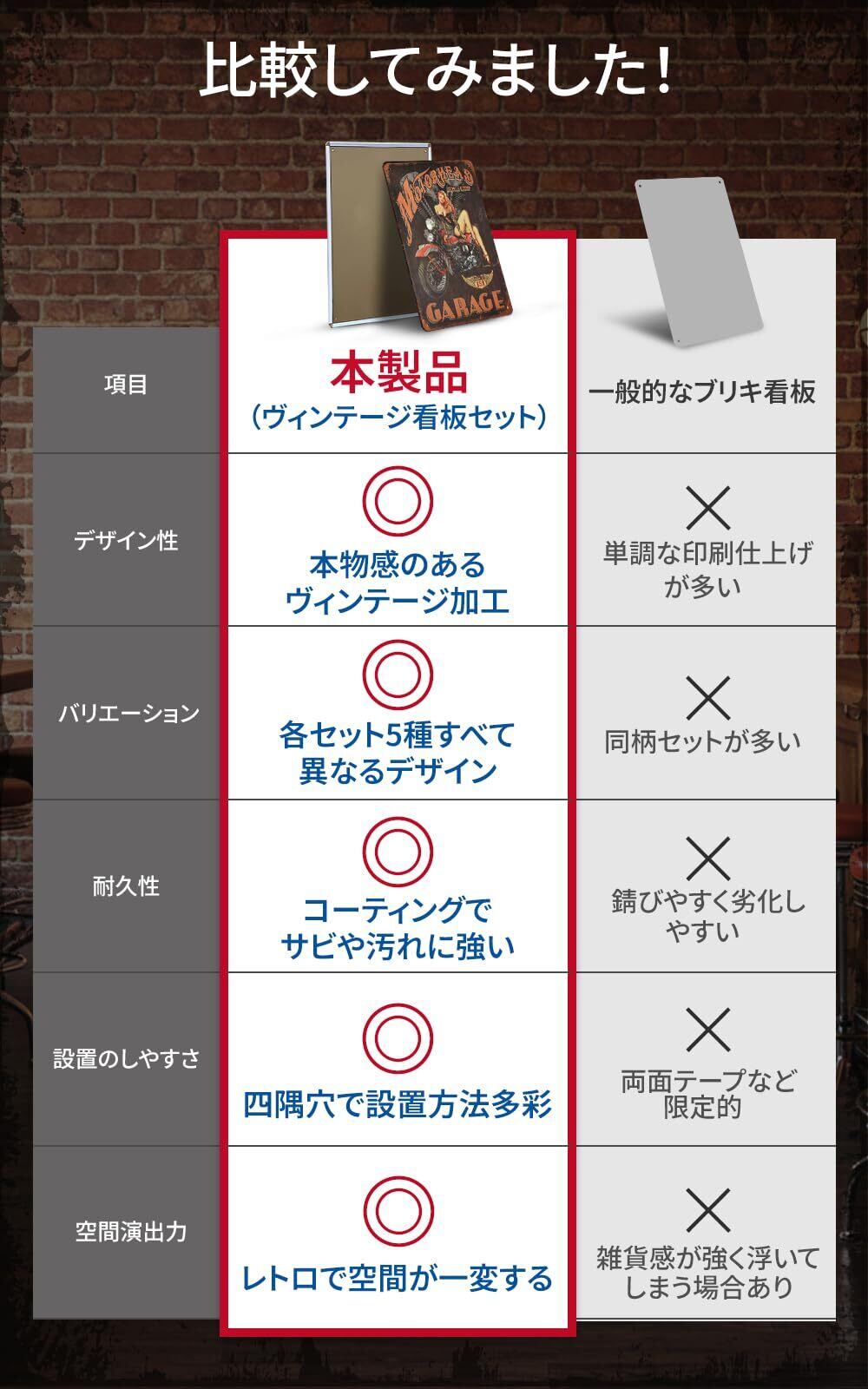【レトロアメリカンなブリキ看板セット】1950年代や1960年代のアメリカンレトロスタイルを再現したデザインが特徴のブリキ看板のセットです。古き良き時代の広告やロゴ、車や食品、飲み物などのモチーフが使われています。