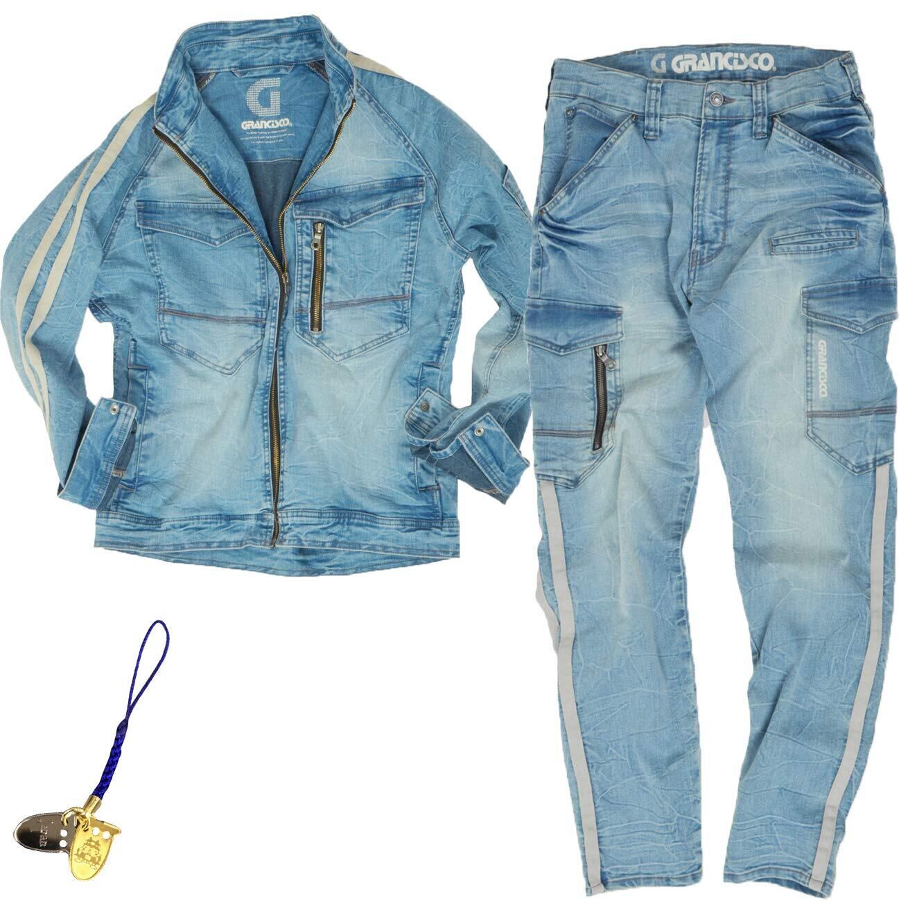 【努力特価】[武蔵野ユニフォーム] 上下セット 作業服 デニムジャケット ストレッチ ラインデニム グランシスコ 作業着 タカヤ商事 オールシーズン こはぜストラップ付《028-GCA800-GCA812-ス》