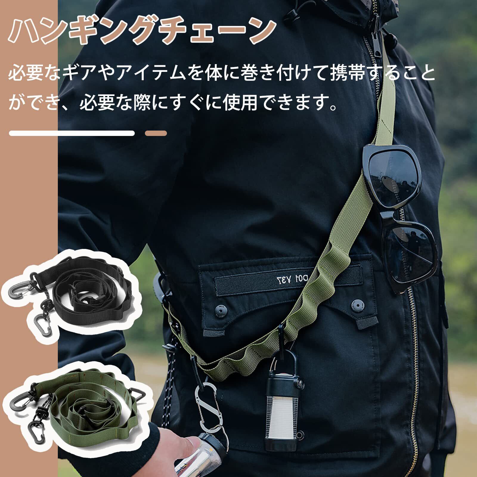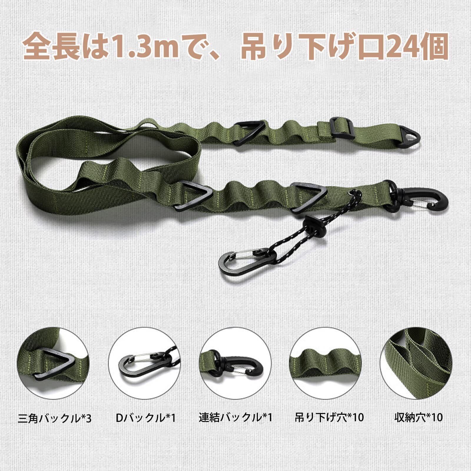 2、【体に巻き付けて携帯】必要なギアやアイテムを体に巻き付けて携帯することができ、必要な際にすぐに使用できます。全長は1.3メートルで、吊り下げ口24個(三角バックル*3、Dバックル*1、連結バックル*1、吊り下げ穴*10、収納穴*10)があり、好きなように組み合わせることができます。とても便利です。