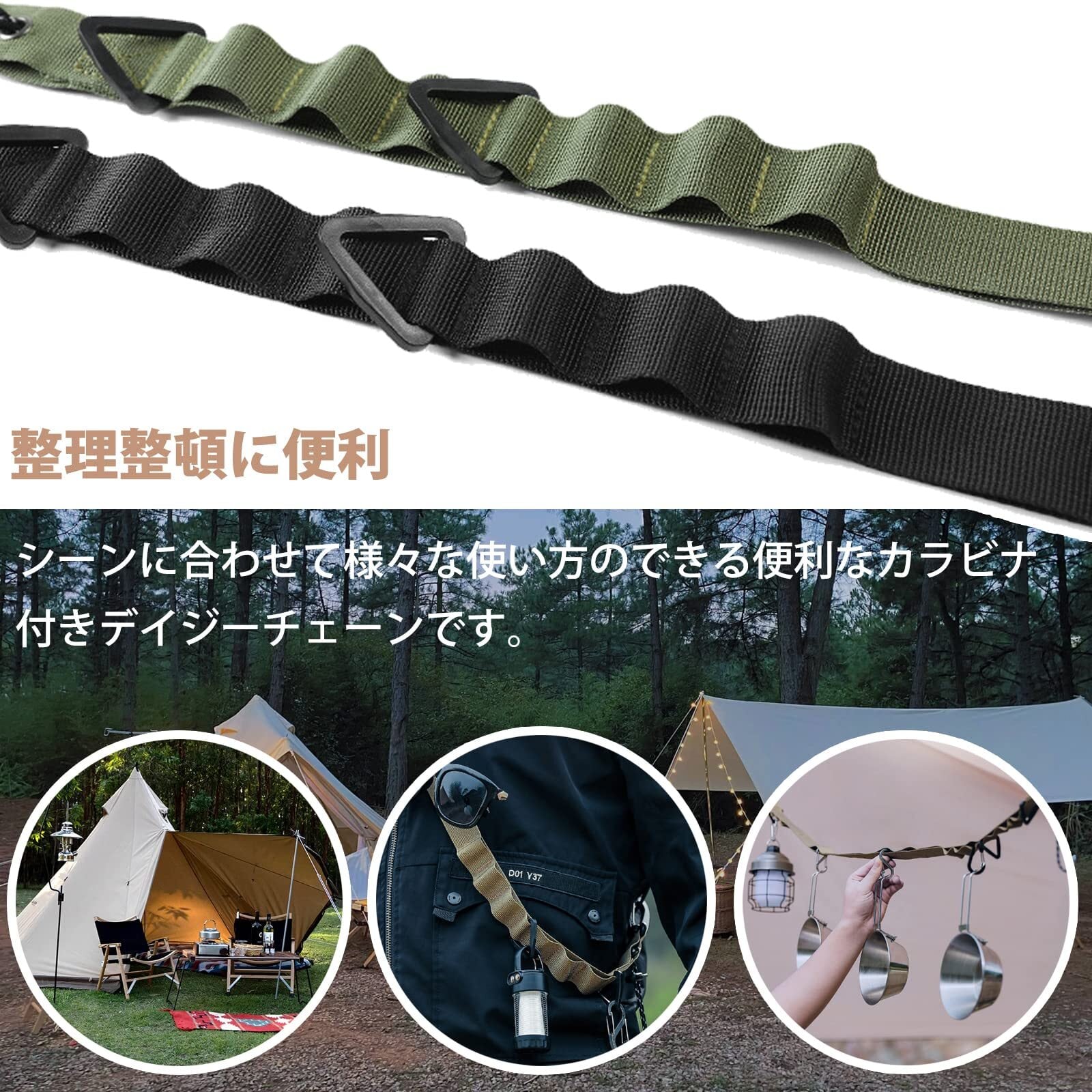3、【整理整頓に便利】シーンに合わせて様々な使い方のできる便利なカラビナ付きデイジーチェーンです。お気に入りのポジションを見つけるため、穴の間隔を細かく設定しています。使用頻度の高いコップやランタンなどを吊るしておけば、キャンプサイトもすっきり整理整頓。テーブルの上もごちゃごちゃしません。