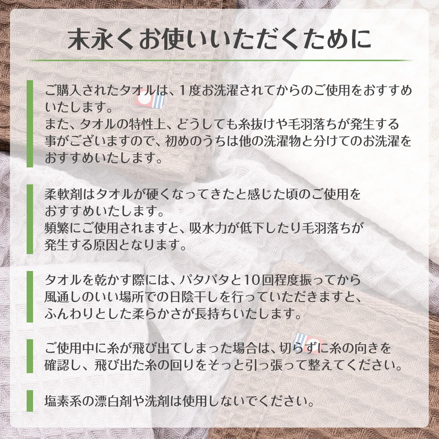 【商品のご注意点】ワッフル生地はその特性上、洗濯後の伸縮が起こりやすくなっております。干す前にはタオルの端を引っ張り、形を整えてから干していただくことで本来の形が長持ちします。