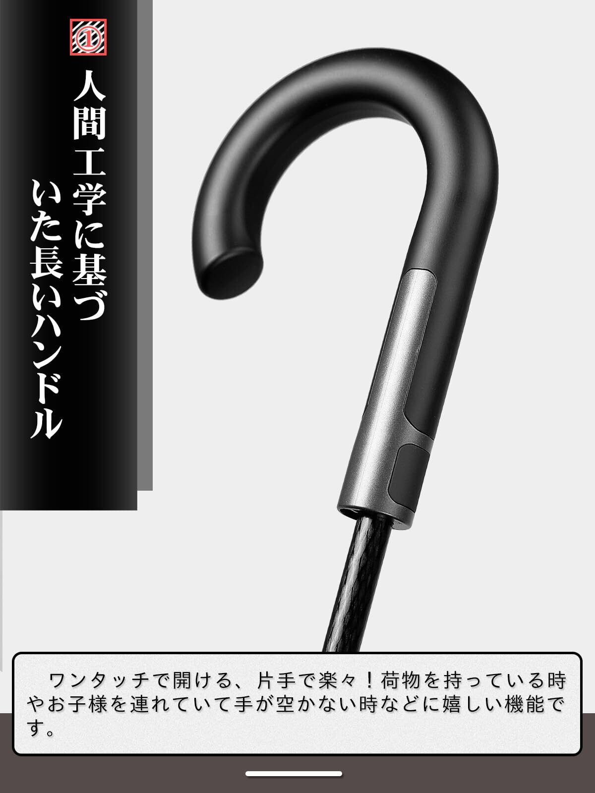 【豪雨&台風対抗の長傘】:わざわざ台風、暴風雨の天気の為に工夫を凝らして設計した耐強風の傘骨となります。強い風にあおられても心強くて安心できる男性専用の紳士傘です。傘骨は柔軟で丈夫なグラスファイバーを採用し、二重構造に出来上がったので今までに無い強度と耐久性を実現しました。かなり耐久性に優れ、暴風雨、台風の天候でも容易に割れたり折れたりする心配がありません。傘の部分が強風で裏返っても元に戻ります。安易に折れたり曲がったりする心配ありません。