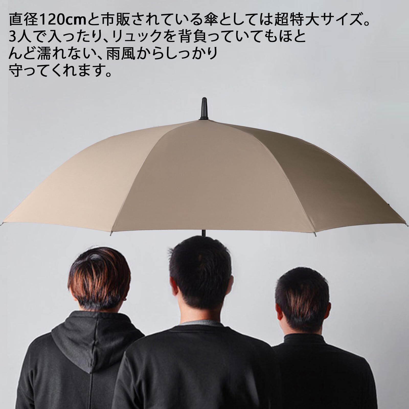 直径120cmと市販されている傘としては超特大サイズ。3人で入ったり、リュックを背負っていてもほとんど濡れない、雨風からしっかり守ってくれます。