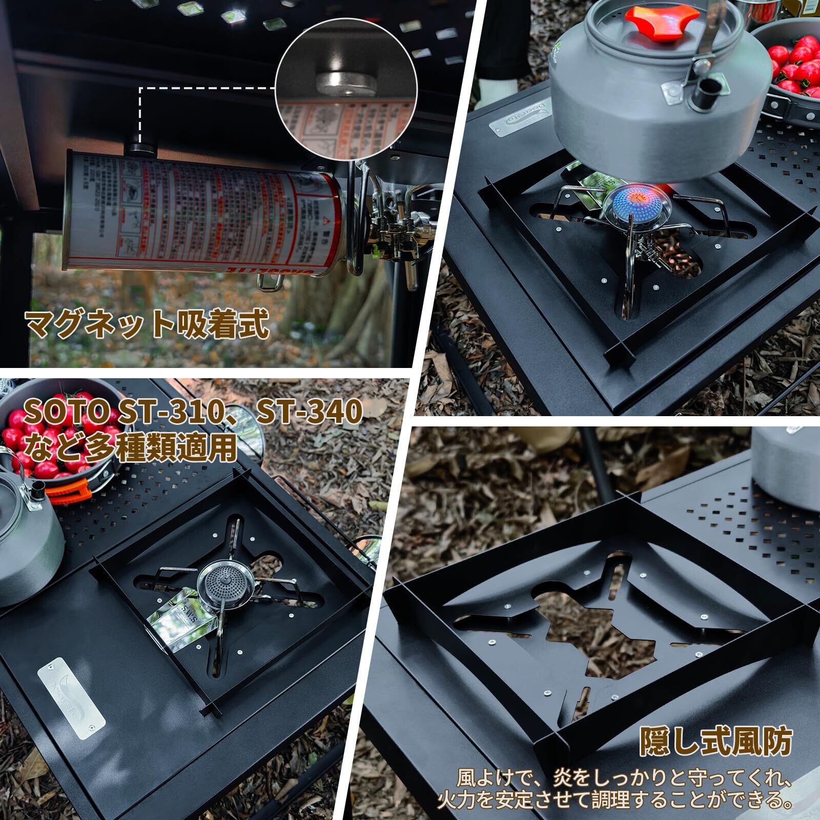 ?【隠し式風防】風よけで、炎をしっかりと守ってくれ、火力を安定させて調理することができ、また、別途風防を準備する必要はなく、使用しない時は、天板の裏面に取り付けて、隠し収納することができます。