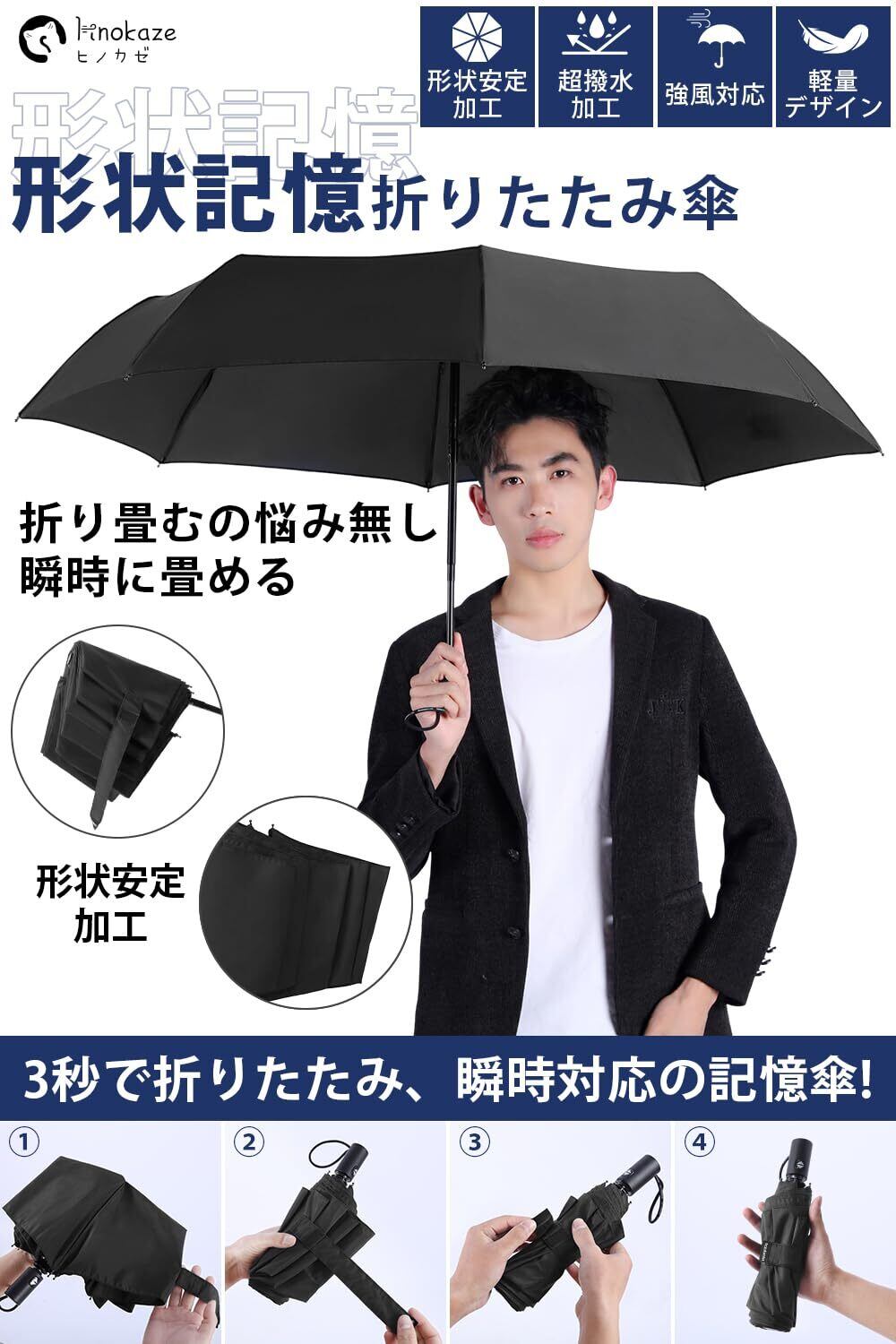 【超軽量で携帯性抜群のワンタッチ自動開閉傘!】「HINOKAZE」の折りたたみ傘は、わずか275gという軽さで、持ち運びが非常に楽です。形状記憶機能を備え、わずか3秒で簡単にたたむことができるため、急な天候の変化にも素早く対応できます!