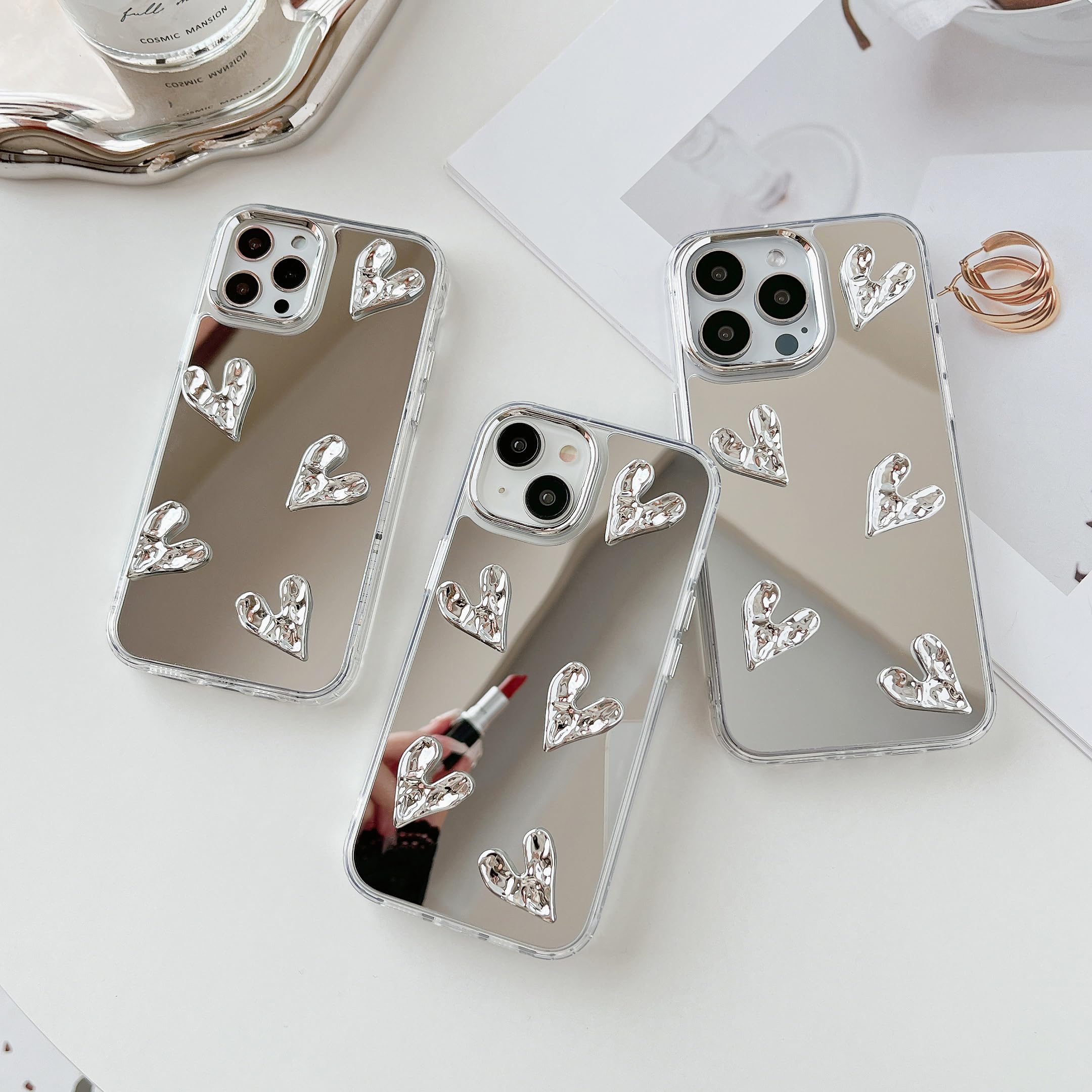 ZTOFERA iPhone 15ケース用、かわいい3Dハートミラーガールズ女性メイク電話カバー 、シルバーハート型透明iPhone 15スマホケース用、5つの心