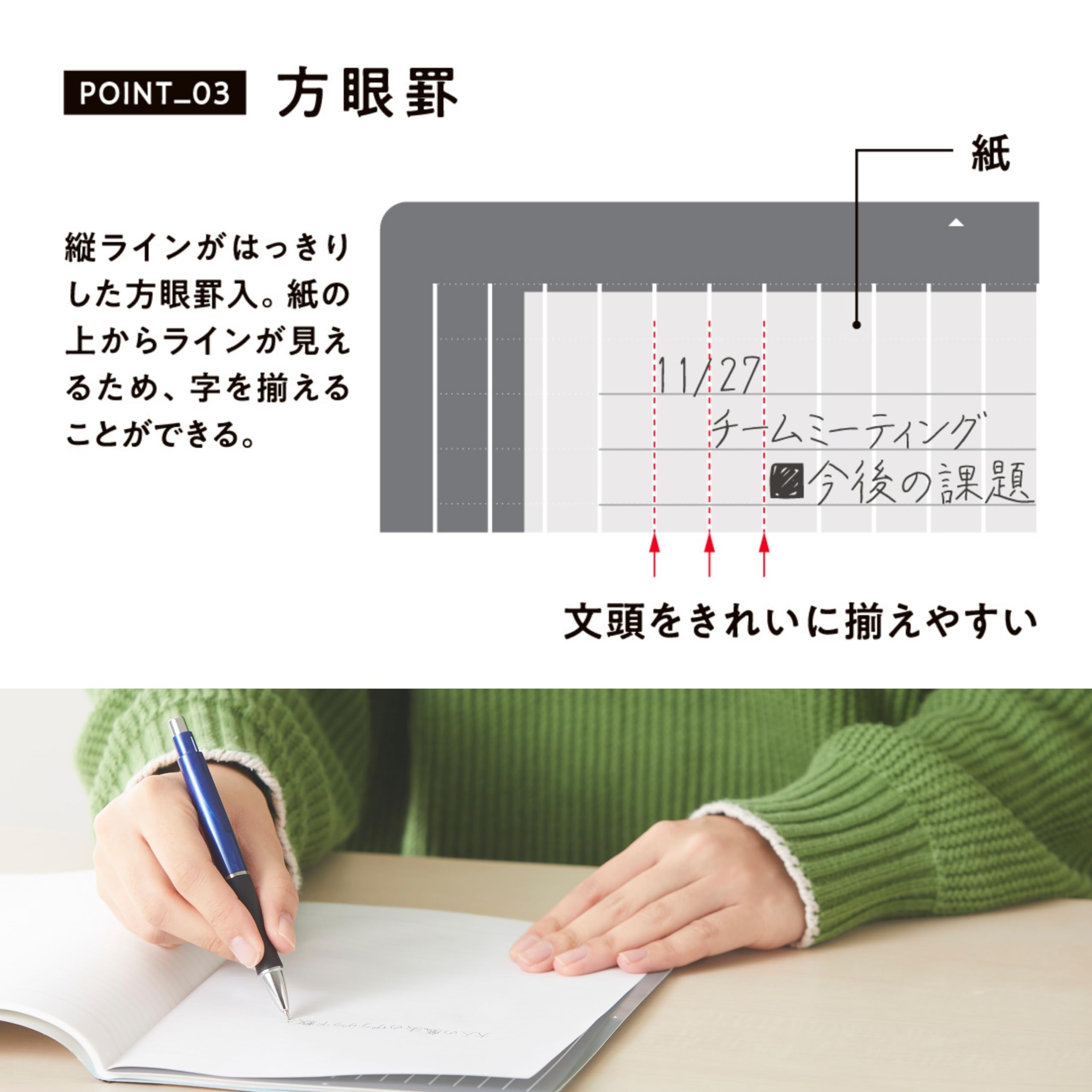 表面には縦ラインがはっきりした方眼罫入り。紙の上からラインが見えるため、字をそろえることができます。