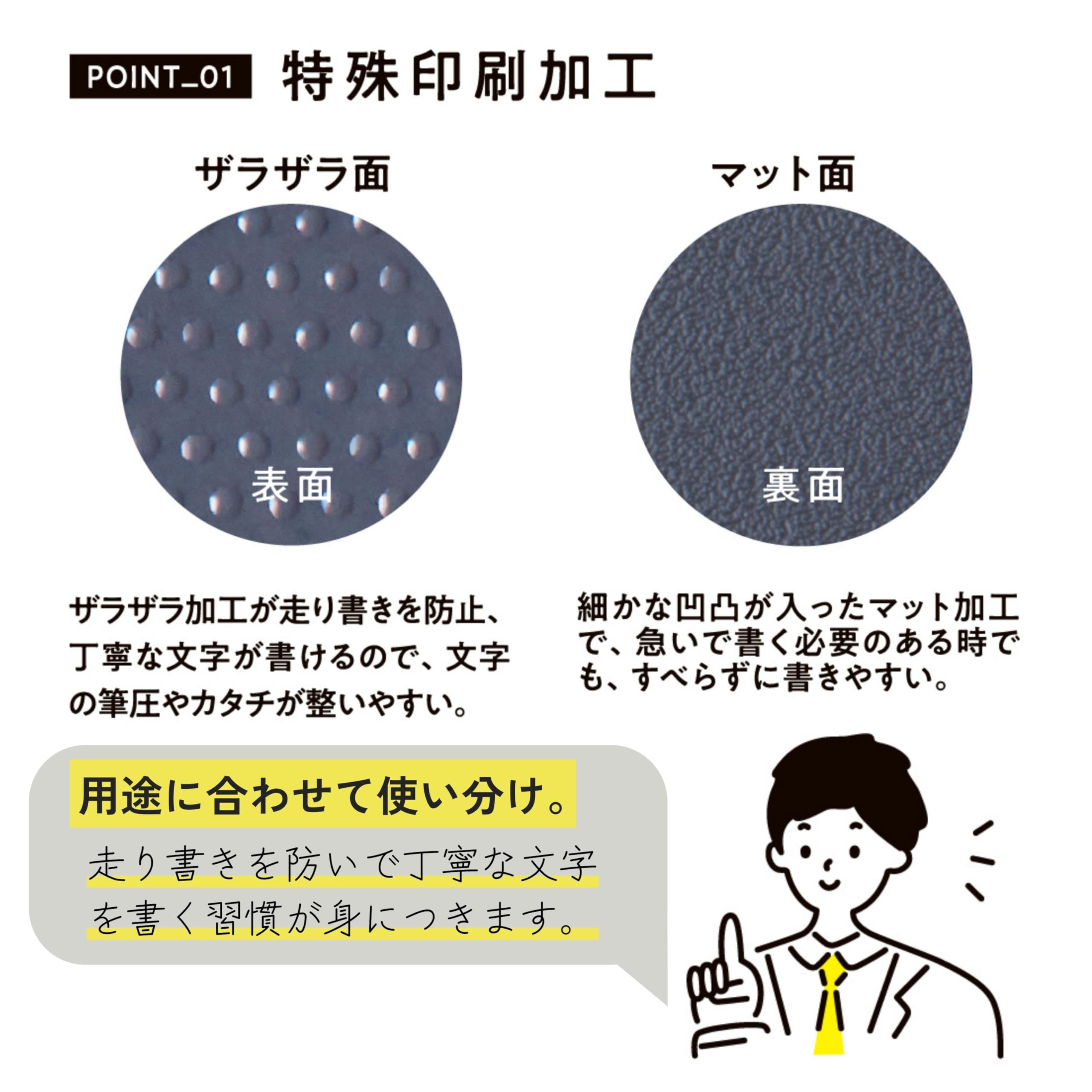 表面のザラザラ加工が走り書きを防止、丁寧な文字が書けるので、文字の筆圧や形が整いやすいです。