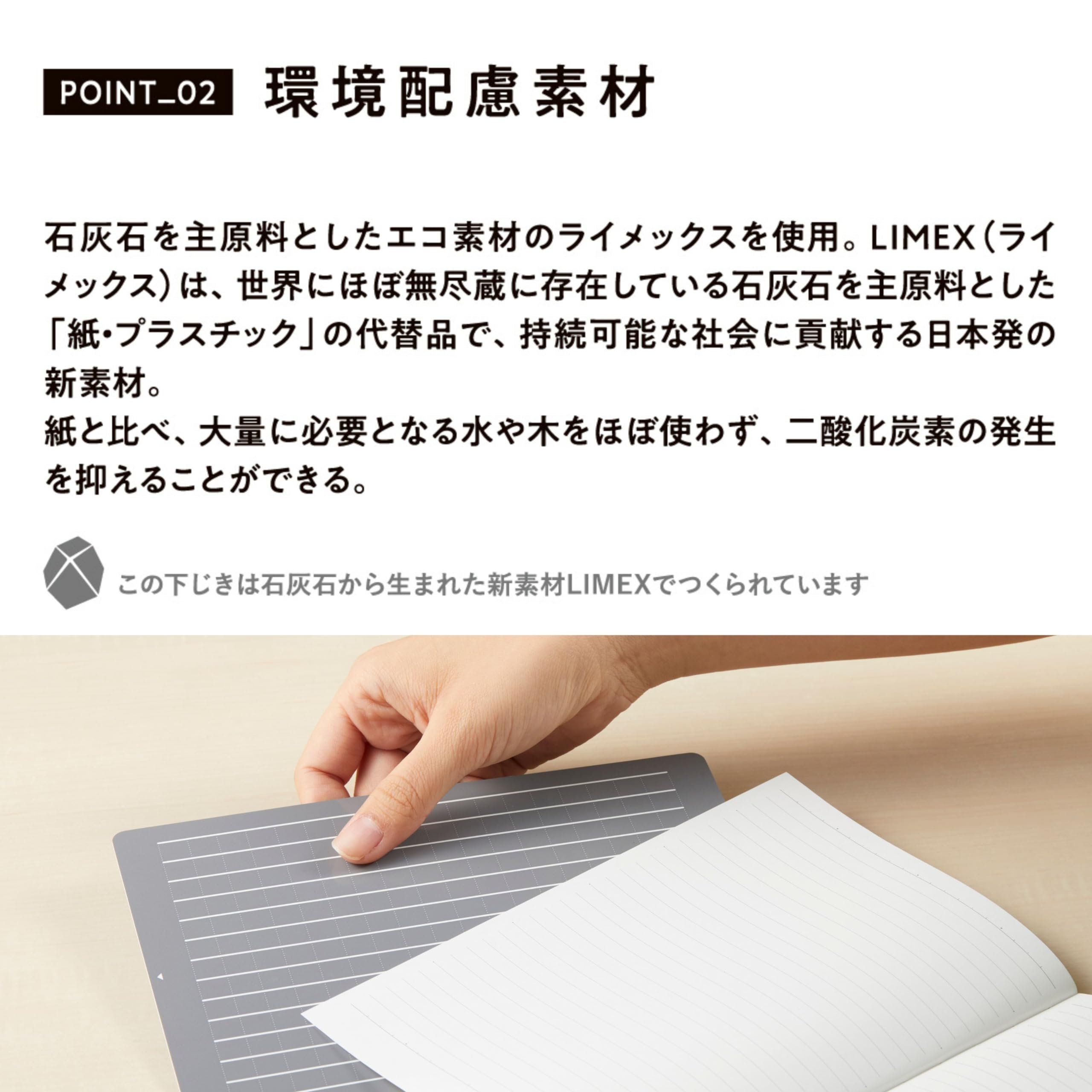 素材には石灰石を主原料としたエコ素材のライメックスを使用。ライメックスは世界にほぼ無尽蔵に存在している石灰石を主原料とした「紙・プラスチック」の代替品で、持続可能な社会に貢献する日本発の新素材です。