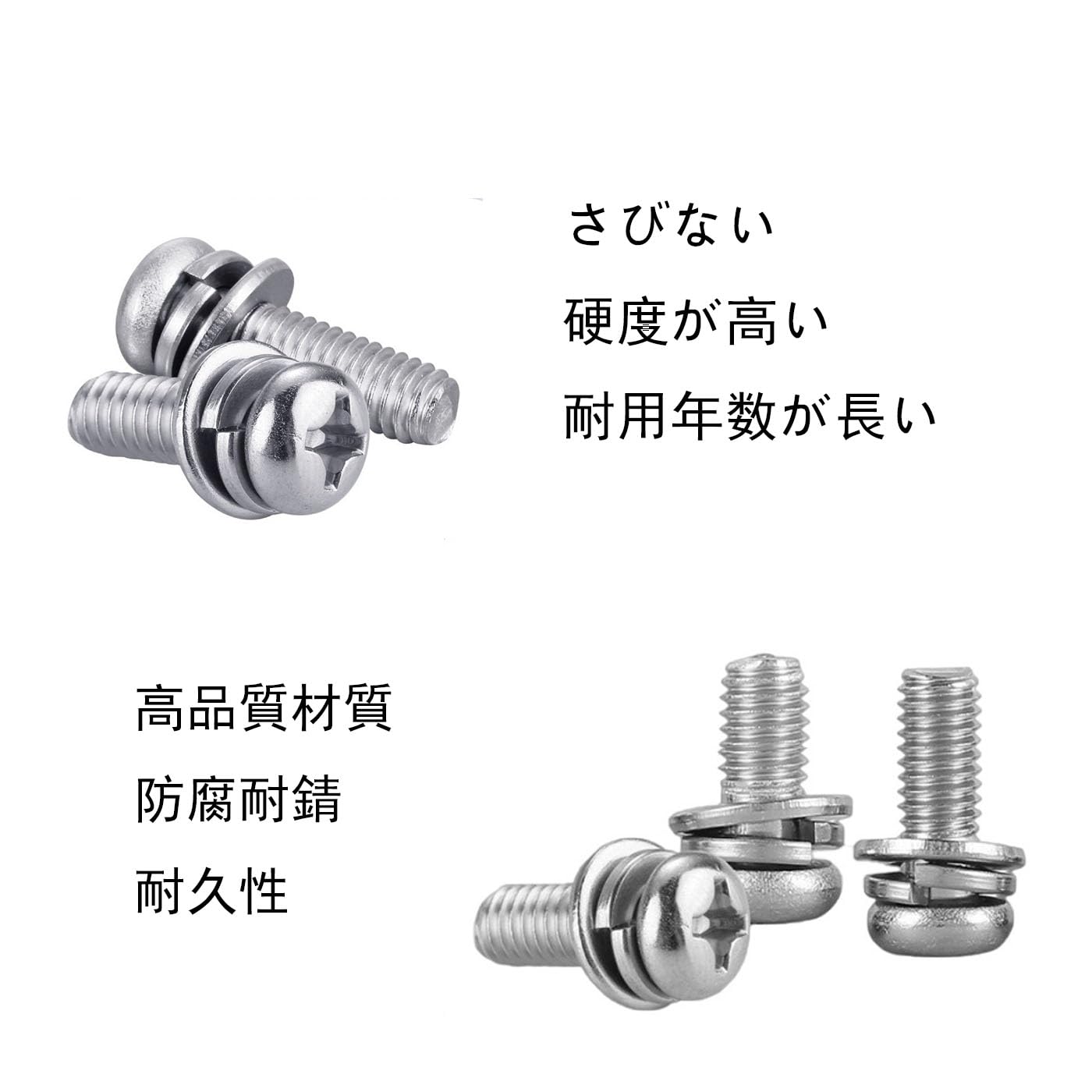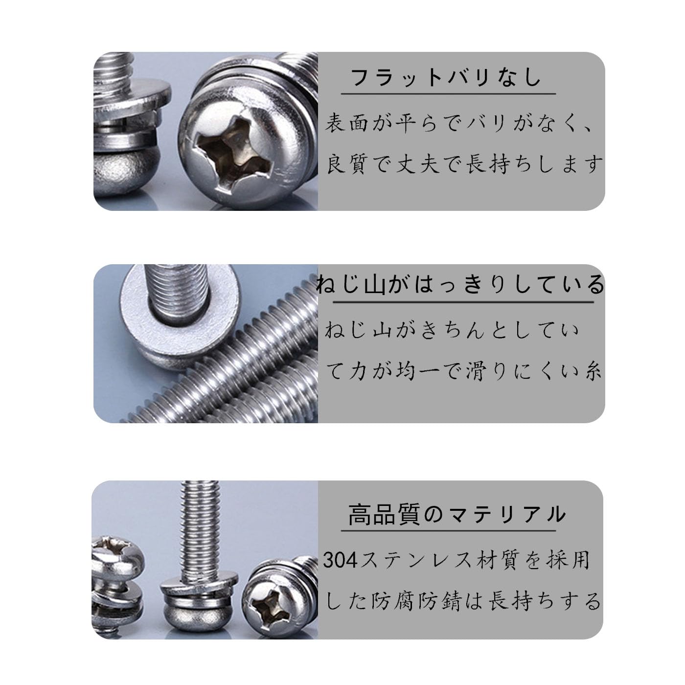 2.良質な材質:304ステンレス材質:ネジは高品質の304ステンレスから作られ、優れた耐食性を持っている。湿気の多い環境、防錆と高い耐食性が必要なシーンに適しており、長期使用で変形せず、破損しないことを確保している。