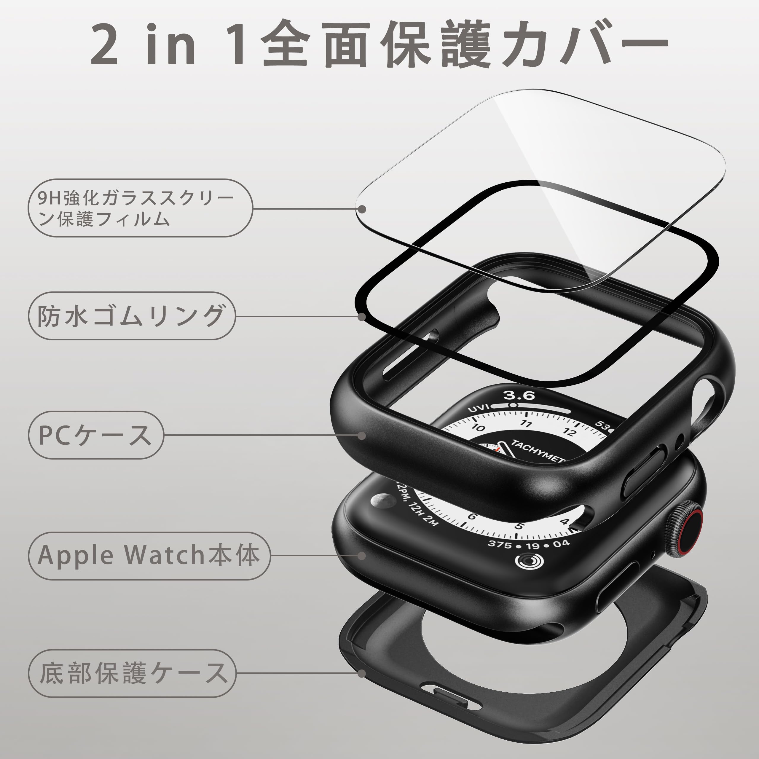 【全面保護&9Hの硬度】このApple Watch カバーの液晶保護フィルムは硬度9Hの強化ガラスを採用し、アップルウォッチ カバーのフレームはPC(ポリカーボネート)素材で構成されます。耐傷性、耐衝撃性に優れ、アップルウォッチへの落下や傷など、不測の事態の損傷を最小限に抑えてます。