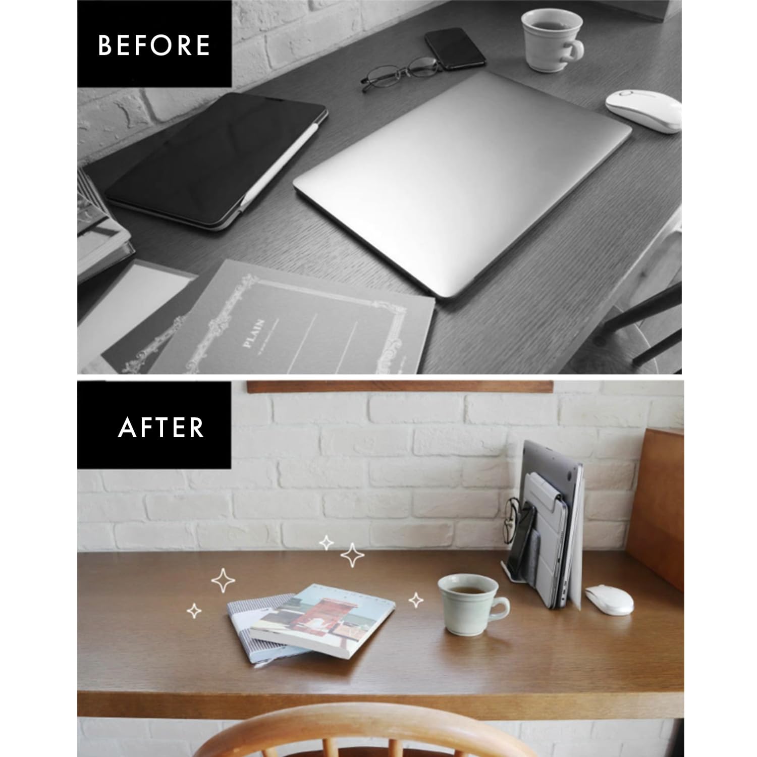 ノートPC等を立てて収納する事で、机上スペースを圧迫せず有効活用可能。