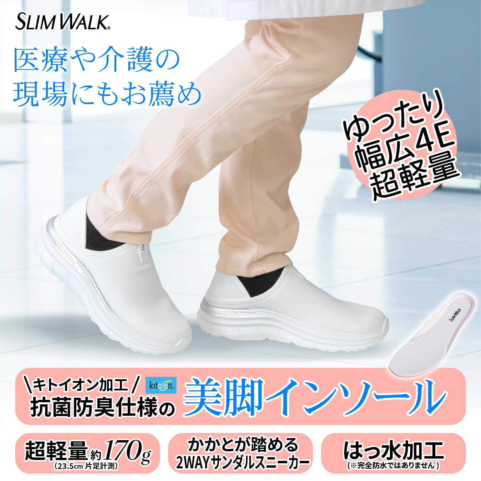 [スリムウォーク] ナースシューズ かかとが踏める 2Way 幅広4E 抗菌防臭 撥水 超軽量 看護 介護 通気性 厚底スニーカー 22.5 23.0 23.5 24.0 24.5 【オリジナル美脚インソール搭載】 ヒールアップインソールによりスッキリ見え、着用時に膝位置が高くなり美脚に見える視覚効果が期待できます つま先からかかとにかけて高くなるウェッジ形状です