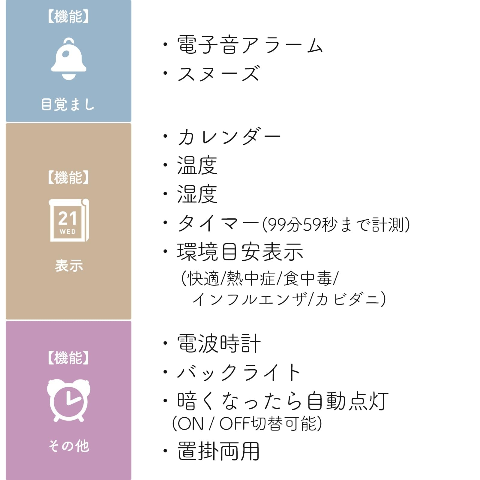 機能:標準時刻電波受信機能(自動受信、手動受信)、タイマー機能 (最長設定時間 99分99秒)、電子音アラーム、スヌーズ機能、生活環境目安表示、温度表示、湿度表示、カレンダー、LEDバックライト、常時点灯機能 (センサー式)、電池交換お知らせ機能