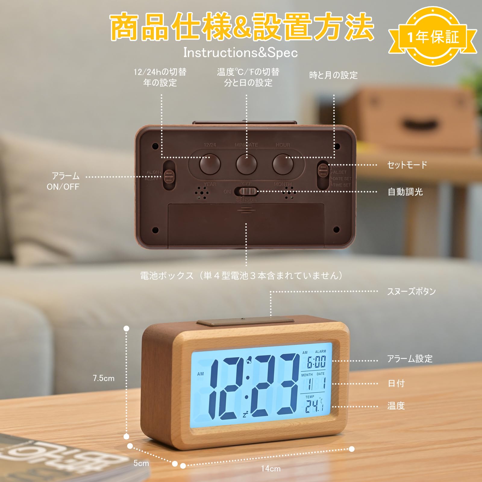 特徴 カレンダー表示, 大音量アラーム, 温度表示, 目覚まし時計, 自動調光可能