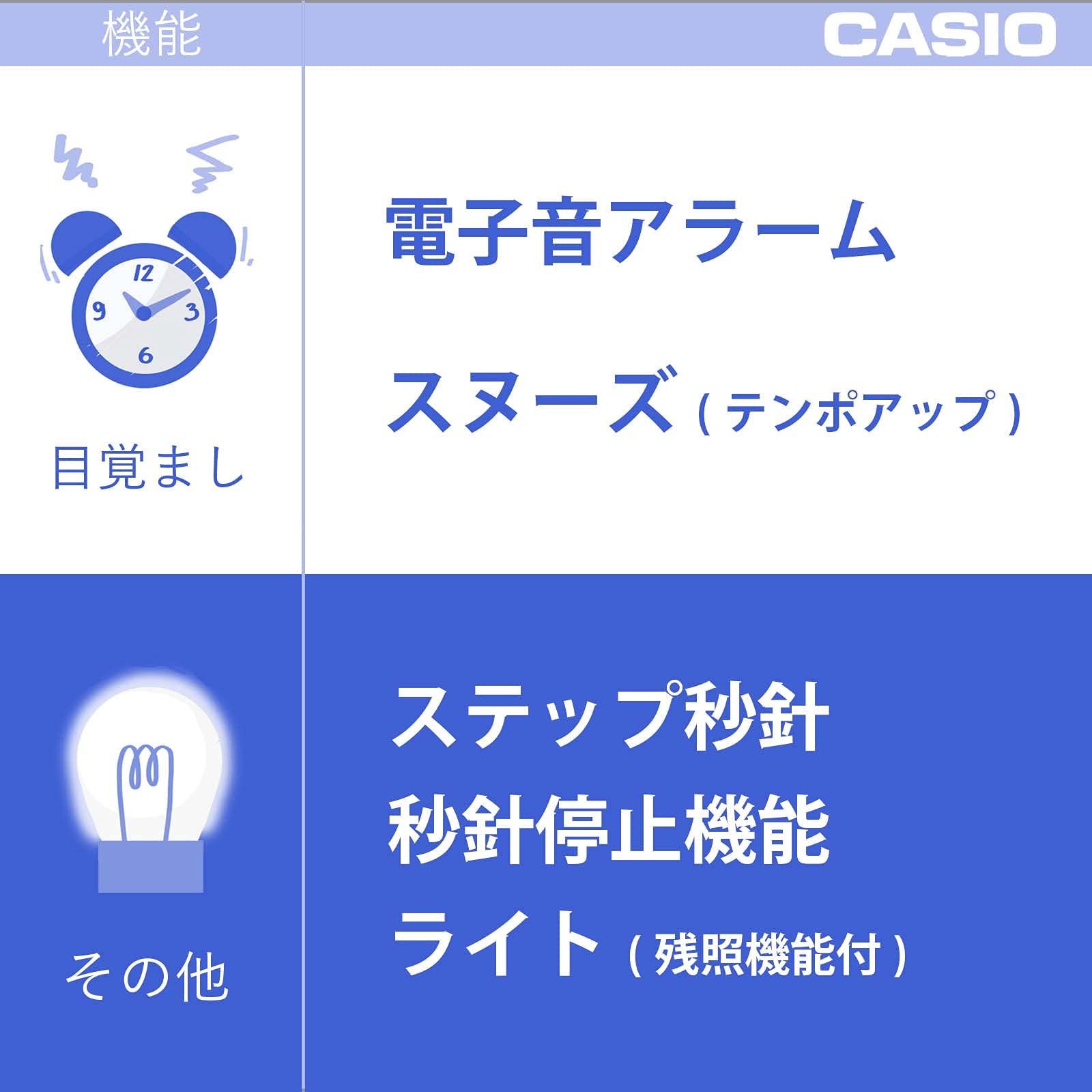 機能:電波受信機能(自動受信/手動受信)、電波受信ONOFF機能、ステップ秒針、電子音アラ-ム、スヌ-ズ機能、ライト(残照機能付き)、秒針停止機能(アラ-ム設定時)