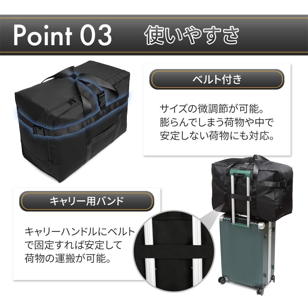 ?【圧縮ベルト】衣類などの荷物の膨らみを抑える2本の圧縮ベルトは、機内預け時にサイズオーバーでの超過料金が未然に防ぎます。また、バッグ内部の余計な隙間が気になる時にも締め付けができて便利です。