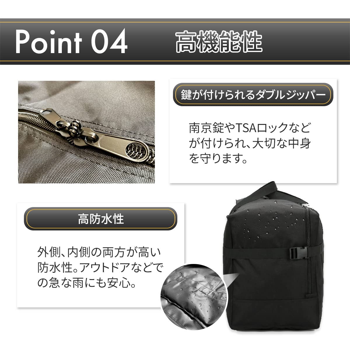 ?【大きく開口】スーツケースや毛布などの大きな荷物や、たくさんの荷物の出し入れが楽。大型ダブルジッパーで耐久性が高く、万が一の開閉を防ぐ錠の使用も可能です。旅行、海外出張や留学の他、アウトドア、キャンプ、ランドリー、入院着や衣類入れなど、様々な用途に幅広く使えます。