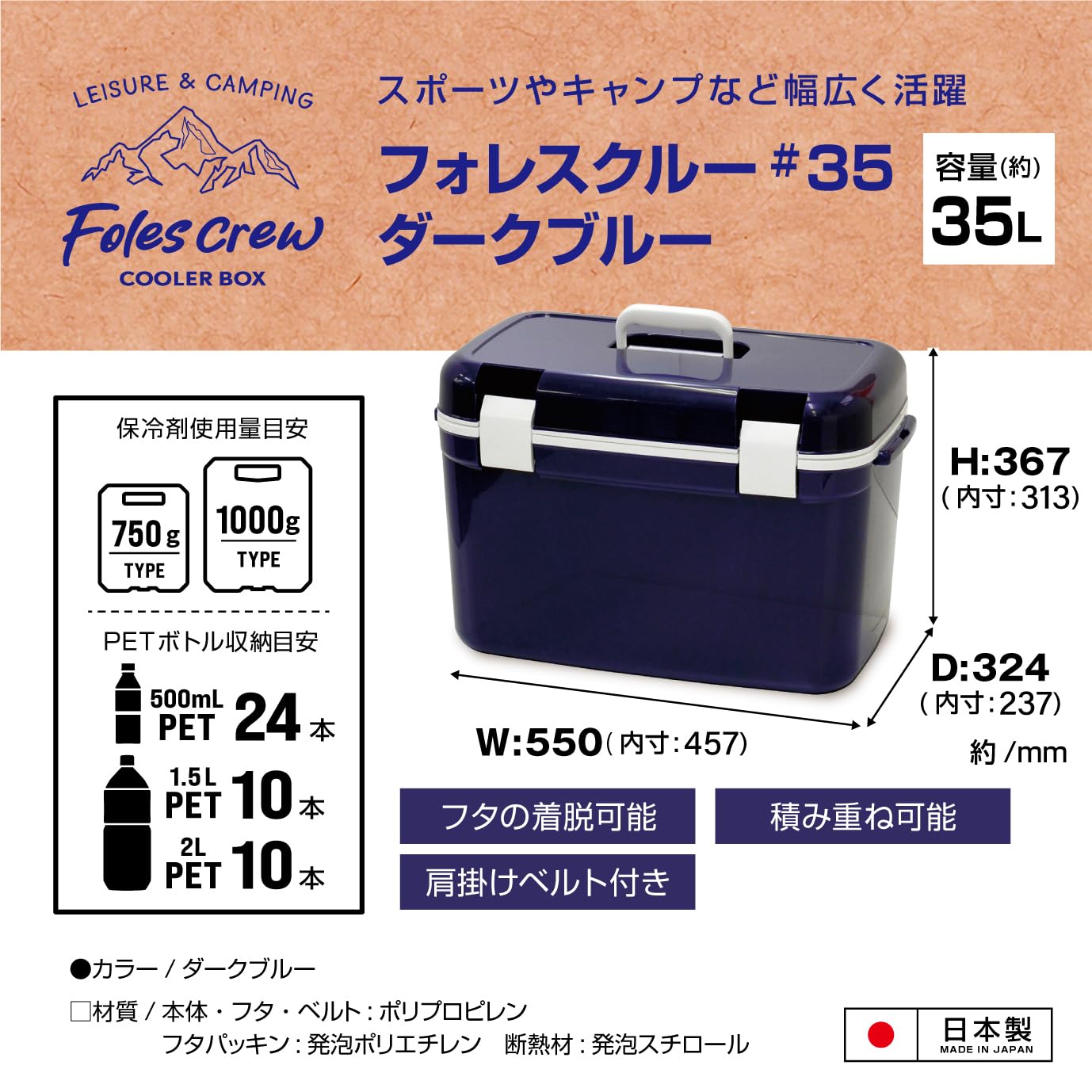JEJアステージ フタが外せてお手入れ簡単 クーラーボックス フォレスクルー ダークブルー 35L 日本製[幅550x奥行324x高さ367㎜]保冷 軽量 ランチボックス 部活 アウトドア お出かけ レジャー スポーツ 500mlペットボトル24本 ショルダーベルト付き
