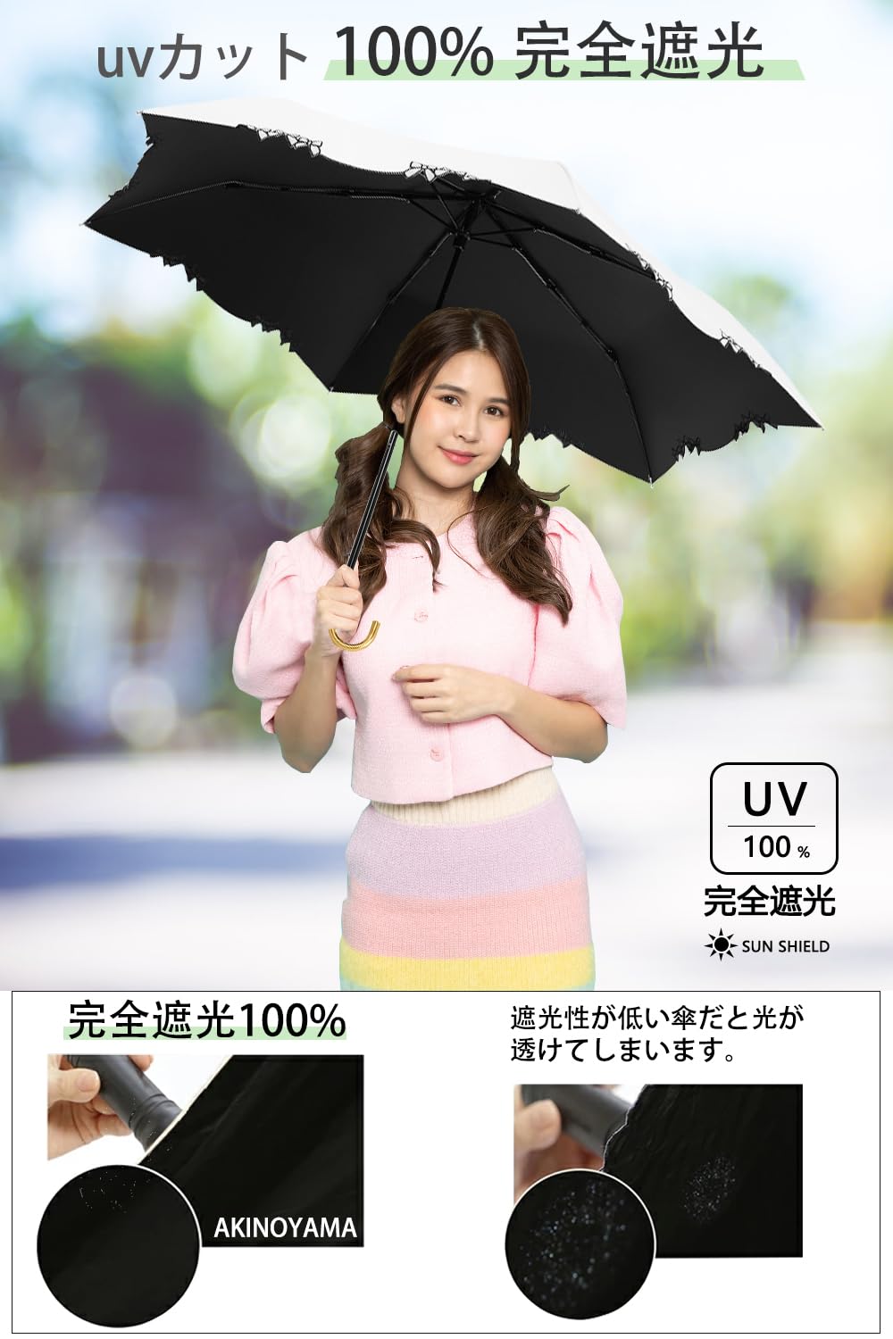 【UV 100 カット&完全遮光】紫外線が気になる季節や敏感肌も徹底ガード。遮光率100%、UVカット率100% を実現。真夏の強い日差しや照り返しから肌を守り、日焼けやシミ・ソバカス対策として高い効果を発揮します。アウトドアやレジャー、スポーツ観戦など長時間屋外にいる場合でも、涼しく快適な日陰空間を提供します。