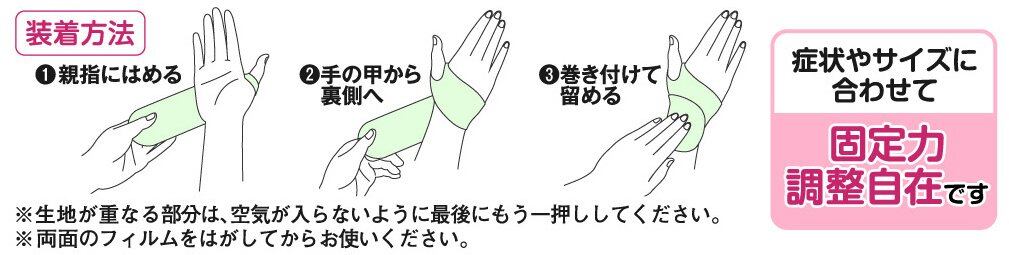 ・巻き終わりが関節の上(手首の側面部分)になると先端部分がめくれ上がることがありますので、巻き終わりの位置を調整してください。