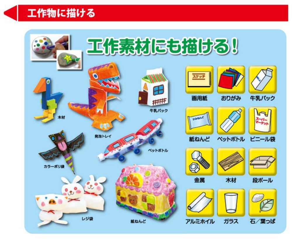 その他、牛乳パックやペットボトル、金属、石ころや葉っぱなど色々な材料に描くことが出来るので、図画だけではなく工作にも最適です。