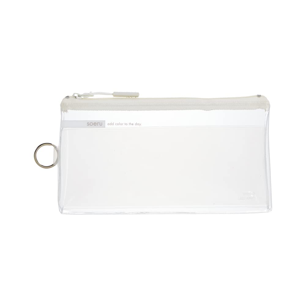 中身が見えて取り出しやすい、クリヤータイプのスリムなペンケース。吊り下げできるリング付き。ふせんや小物が入る背面内ポケット付き。ペンが約20本入ります。スマートフォンを入れたままタッチ操作できます。