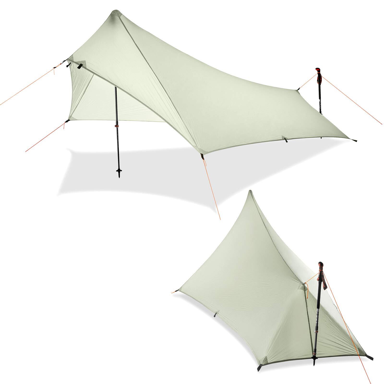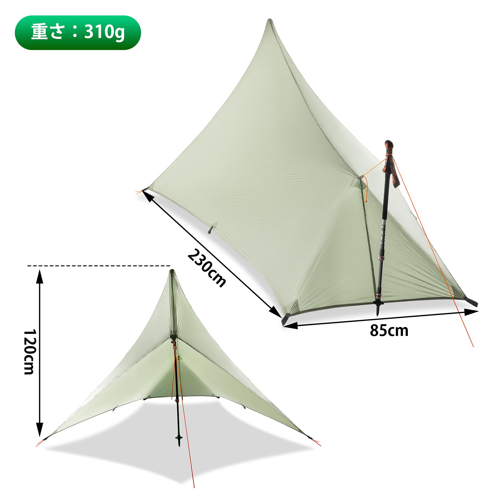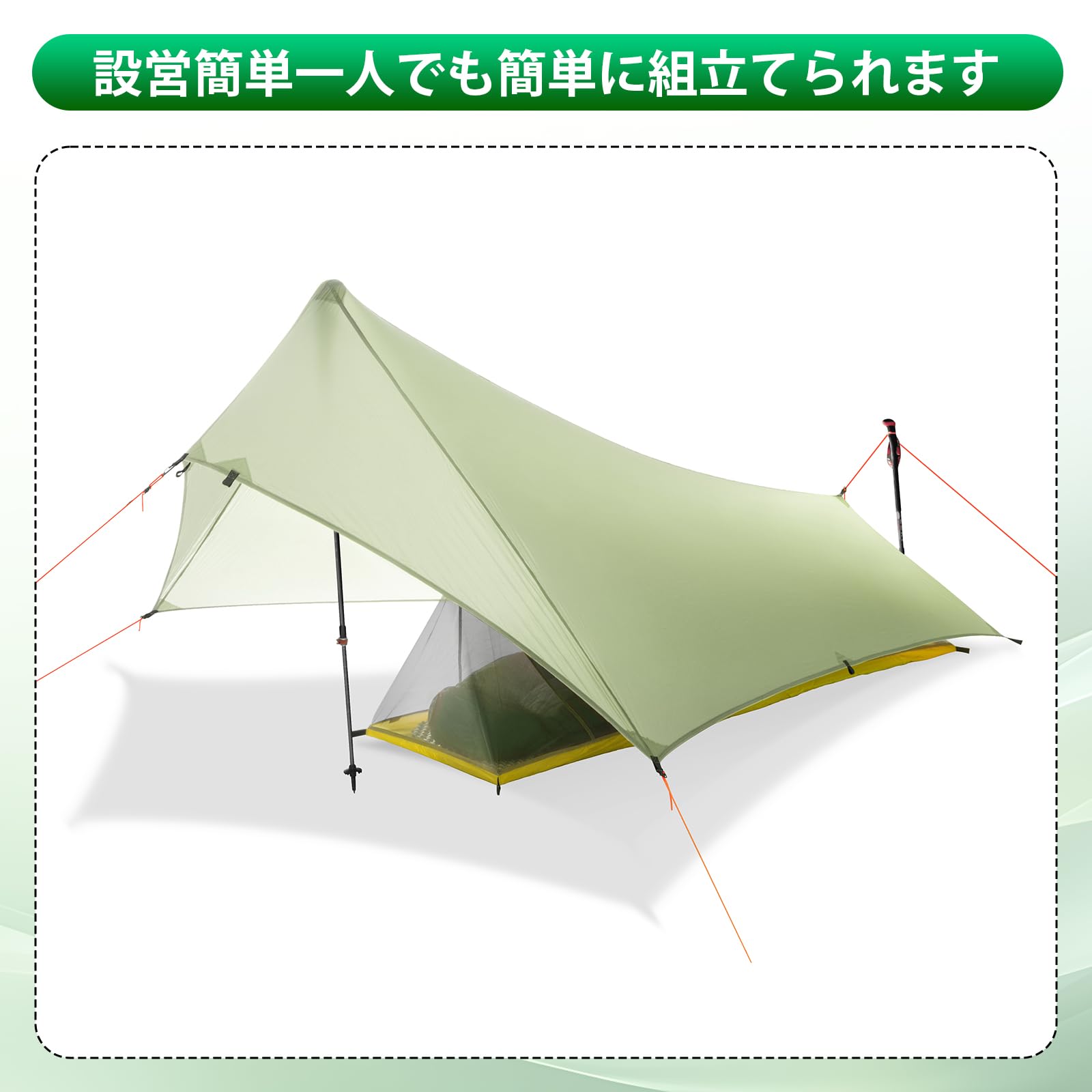 【設営簡単】ペグを打ち込み、トレッキングポール2本を立てるだけで、一人でも簡単に組立てることが可能です。設営動画がメールで送ります。