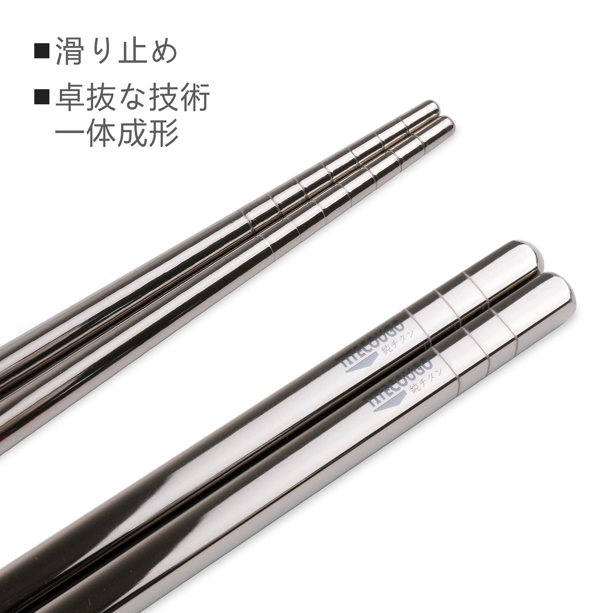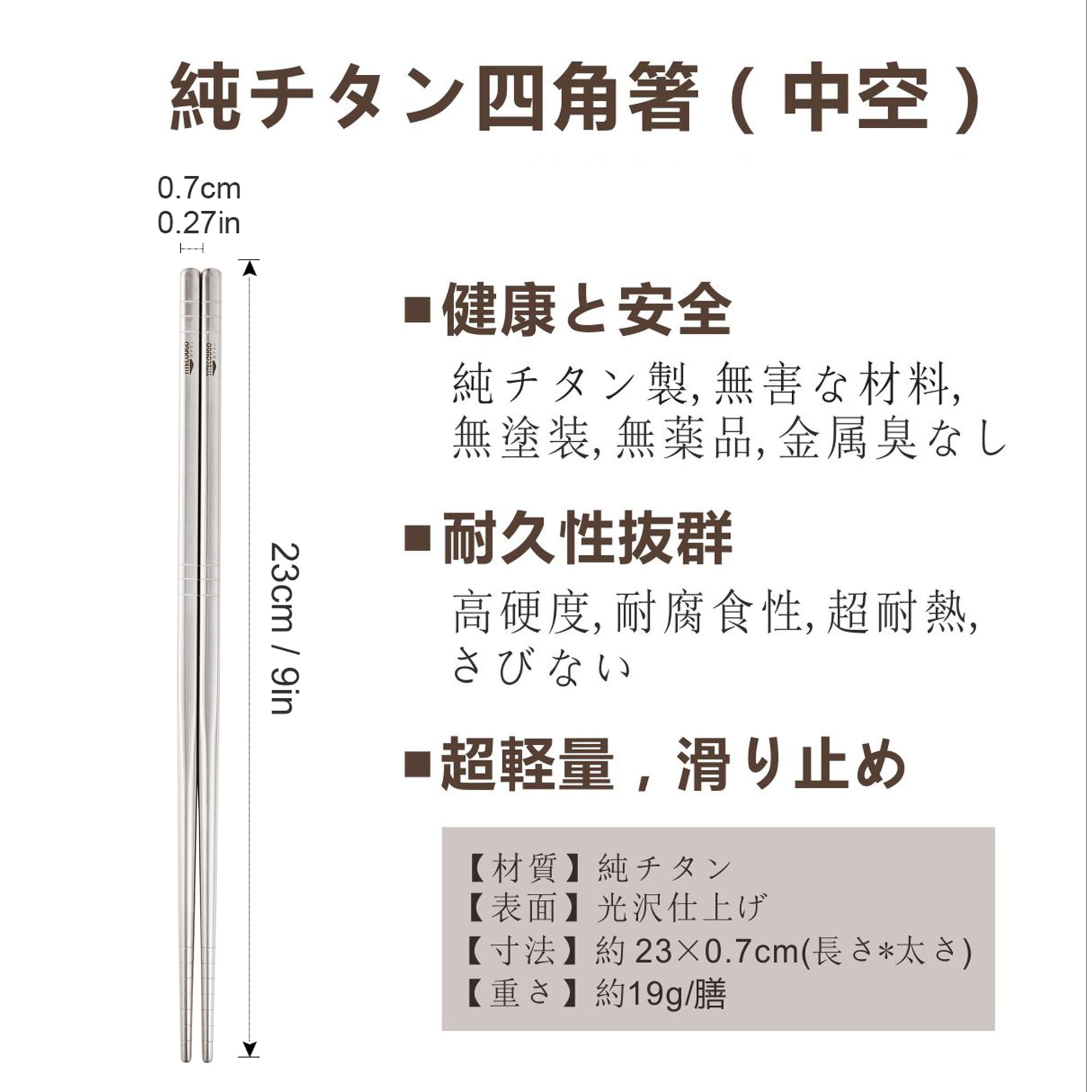 TITECOUGO 純チタン角箸 アウトドア箸(約20g、長さ23cm、幅0.7cm) 滑り止め 無塗装 中空構造 軽さ 耐久性抜群 可直火焼 キャンプ バーベキュー 寿司 出張で使う 収納袋付き 1膳/2膳