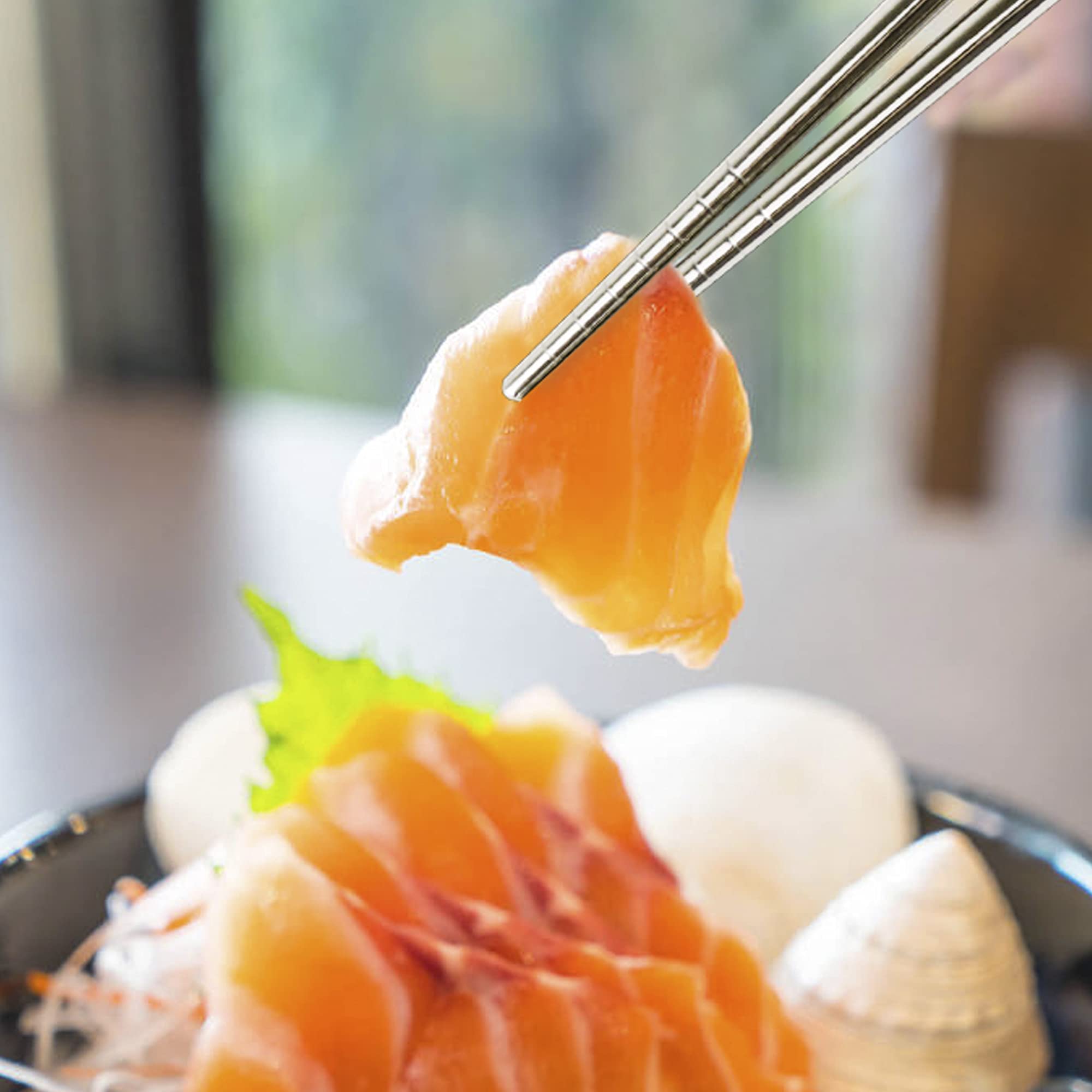 滑り止め中空構造: チタン箸の先端に滑り止め構造により小さいや丸状食べ物或いは細長い麺等を取っても落ちにくい、使い勝手がいい。本体が中空構造なので、持ち手に負担をかけません。熱伝導率が低いですので,料理から熱がうばわれにくいため,アツアツの料理が食べられる傍ら,箸自体は熱くなりにくいです。箸はチタン製ですから(金属製品)、ぶつかると音がします
