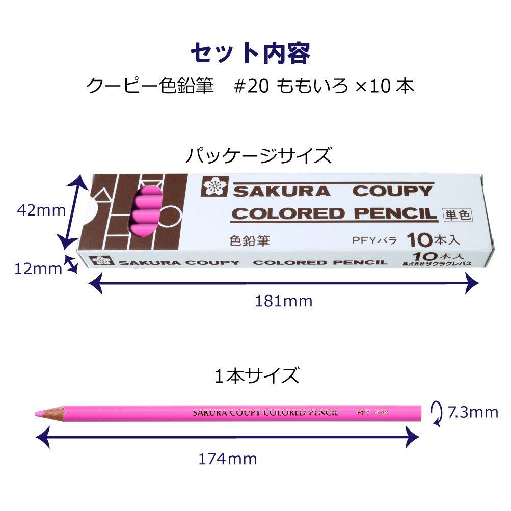 サクラクレパス クーピー色鉛筆 PFYバラ10P#20 桃 10本 【特長1】消しゴムで消しやすい色鉛筆 【特長2】ポリマー芯なので均一な品質 【特長3】折れにくい色鉛筆 【サイズ】Φ7.3×174mm/本 【入数】10本入り φ3.2mm×174mm ・「クーピー色鉛筆」は従来品の色鉛筆と異なり、消しゴムで消しやすい色鉛筆となっています。 ・ポリマー芯なので均一な品で、軸の中で芯が折れているといったことがほとんどありません。 ・ ・本商品は単色10本セットとなっています。