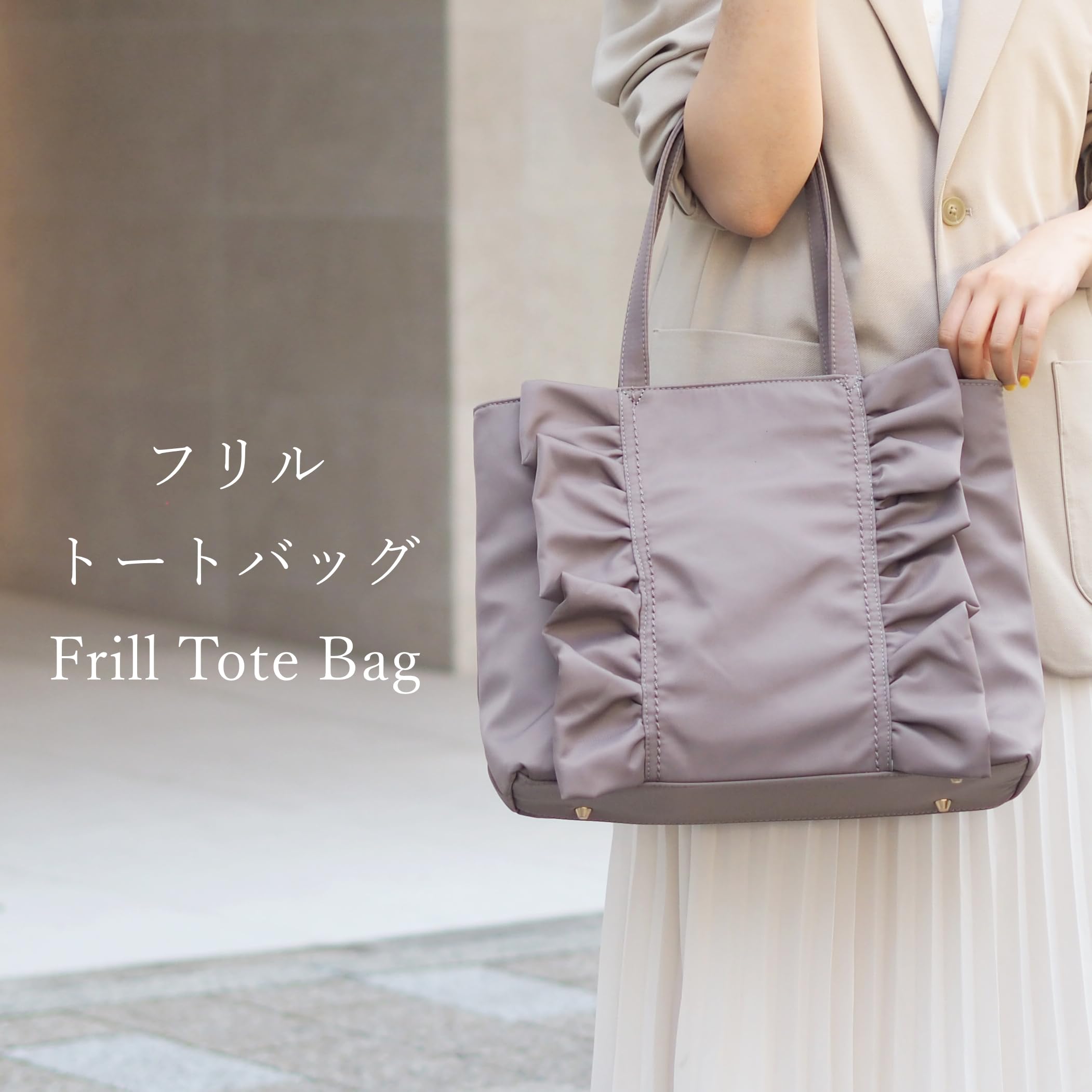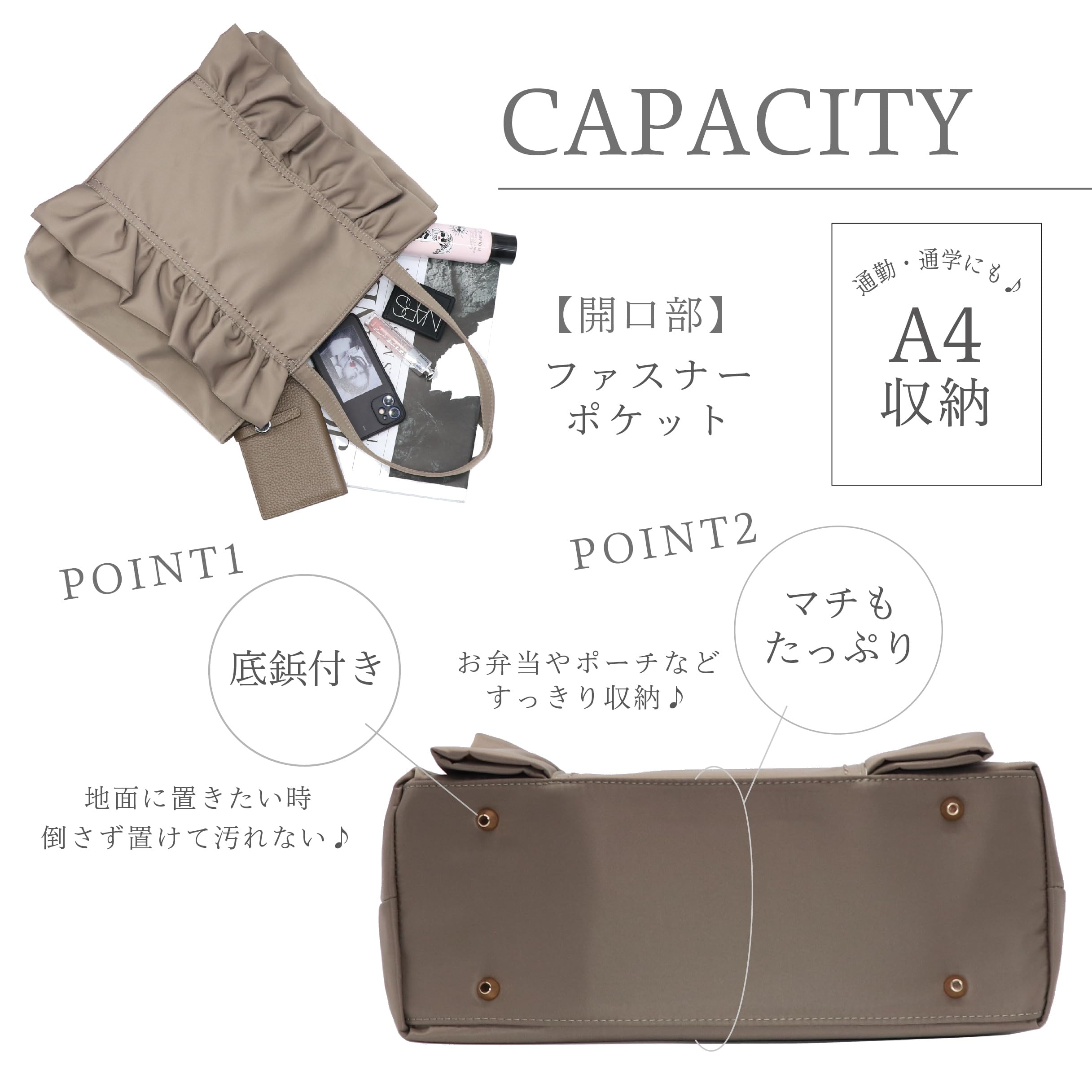 ①フリルが大人かわいいデザインのトートバッグ ②ハンドルも肩に掛けやすい長さで使い勝手の良いサイズ感! ③内側にはボトルホルダー付きで通勤通学、普段使いにと便利な仕様になっています 底鋲が付いているのもポイントです♪