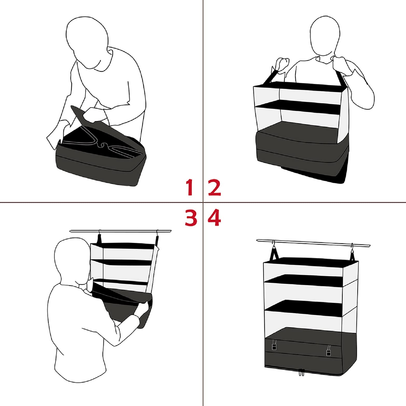 【素材】ポリエステル 【カラー】ブラック ブルー グレー ローズ カチオングレー 【吊り下げサイズ】Lサイズ:30*30*61CM XLサイズ:45*30*62CM 【荷物を入れた収納サイズ】Lサイズ:30*30*13CM XLサイズ:45*30*13CM 【不使用時の折畳みサイズ】Lサイズ:30*30*4CM XLサイズ:45*30*4CM