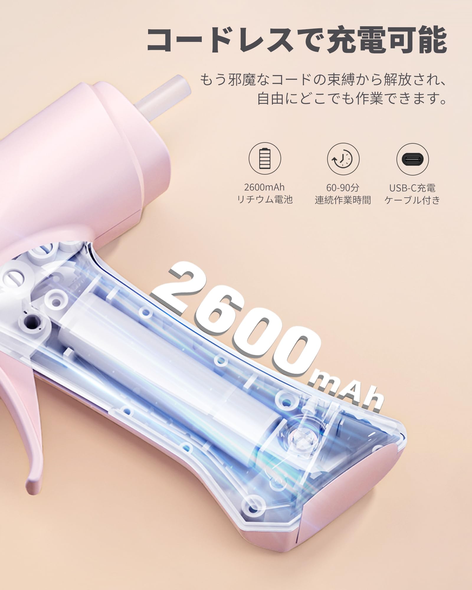 【コードレスで持ち運び便利】当社のグルーガンは軽量設計で、わずか198gの軽さです。長時間使用しても手の疲れを感じることはありません。コードレスでスタンドデザインなので、どこでも自由にご使用いただけます。また、内蔵の2600mAhリチウムイオンバッテリーにより、連続作業は60?90分可能で、わずか120?150分で完全充電できます。