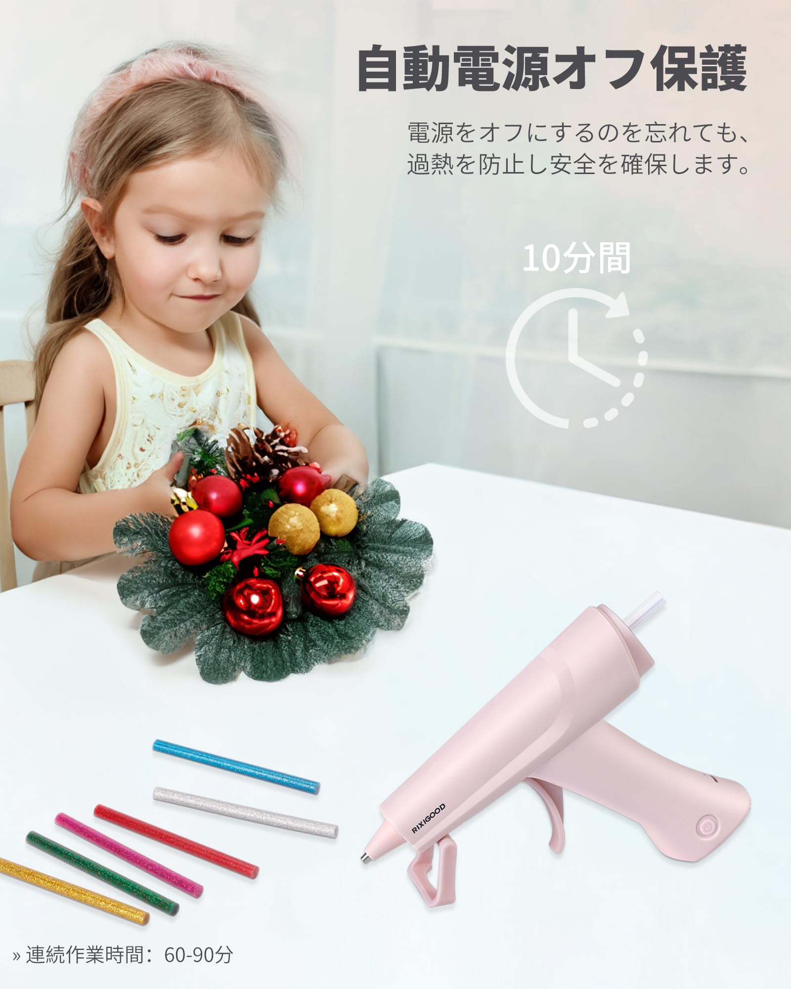 【豊富なアクセサリーが付属】当社のコードレスグルーガンキットには、ピンクのグルーガン1台、Φ7mm×100mmのグルースティック30本、シリコンパッド1枚、指サック3枚、USB-Cケーブル1本、取扱説明書1冊が含まれています。シリコンパッドは作業台にグルーがうっかり垂れ落ちるのを防ぎますし、指サックは誤って火傷することを防ぎますので、安全にご使用いただける優れたツールです。