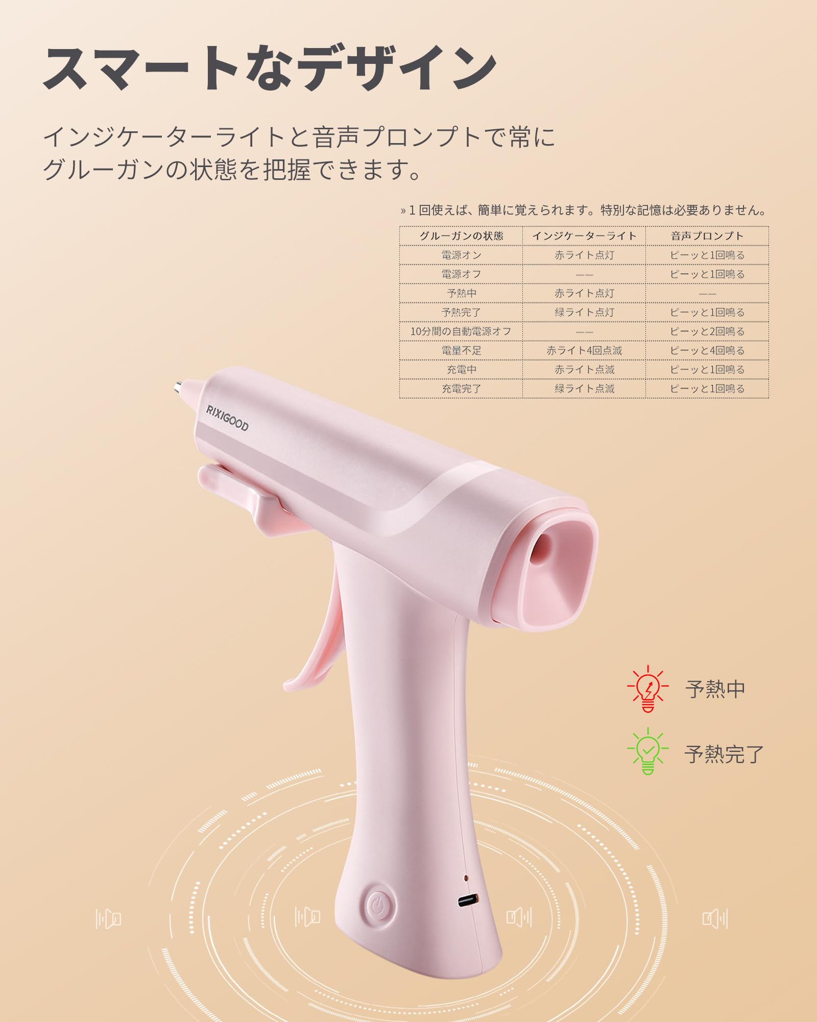 【スマートなデザイン】当社の充電式グルーガンは、電源オン/オフ、予熱中、電量不足、充電中、充電完了など、さまざまな状態を示すスマートなインジケーターライトと音声案内付きです。これにより、簡単で便利な操作が可能で、常にグルーガンの状態が把握できます。