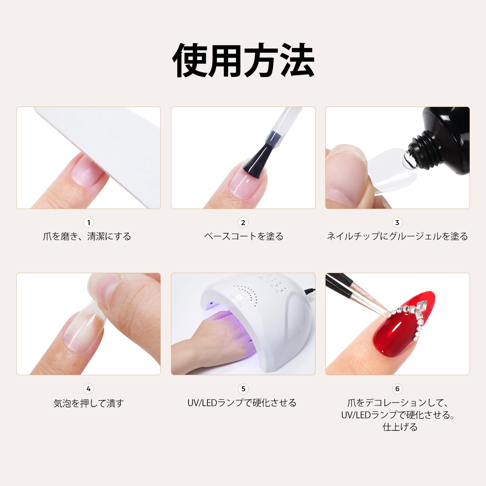 硬化が必要:TOMICCA クリア ジェルネイルグルーをネイルチップに塗布し、爪に貼り付けた後、乾燥してしっかりと貼り付くまでネイルランプの下で 60 秒硬化する必要があります。