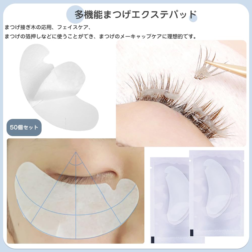 セット内容:まつげエクステパッド50個セット。パッケージサイズ:(長さ約11cm、幅約7cm)、アイシールサイズ:(長さ約7.5cm、幅約2.8cm)。単品重量:2g。