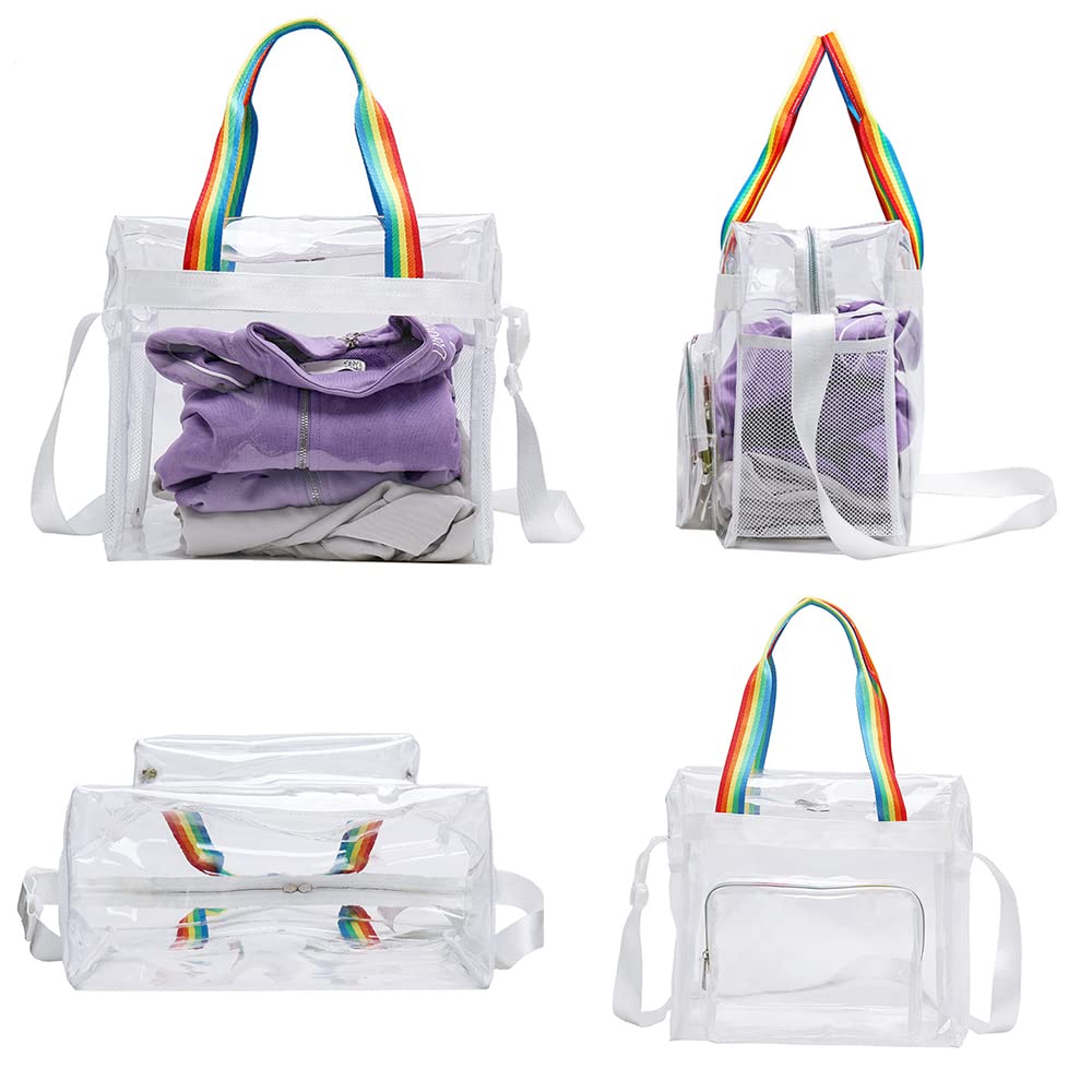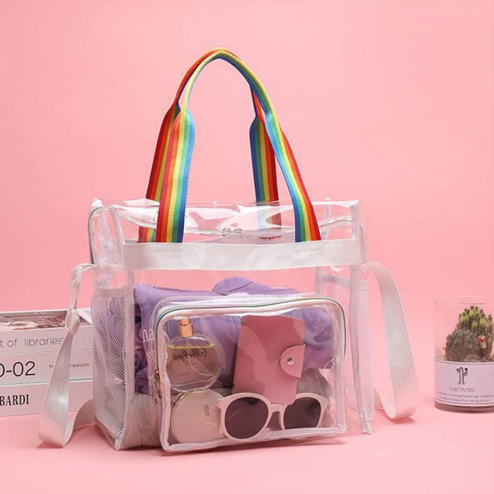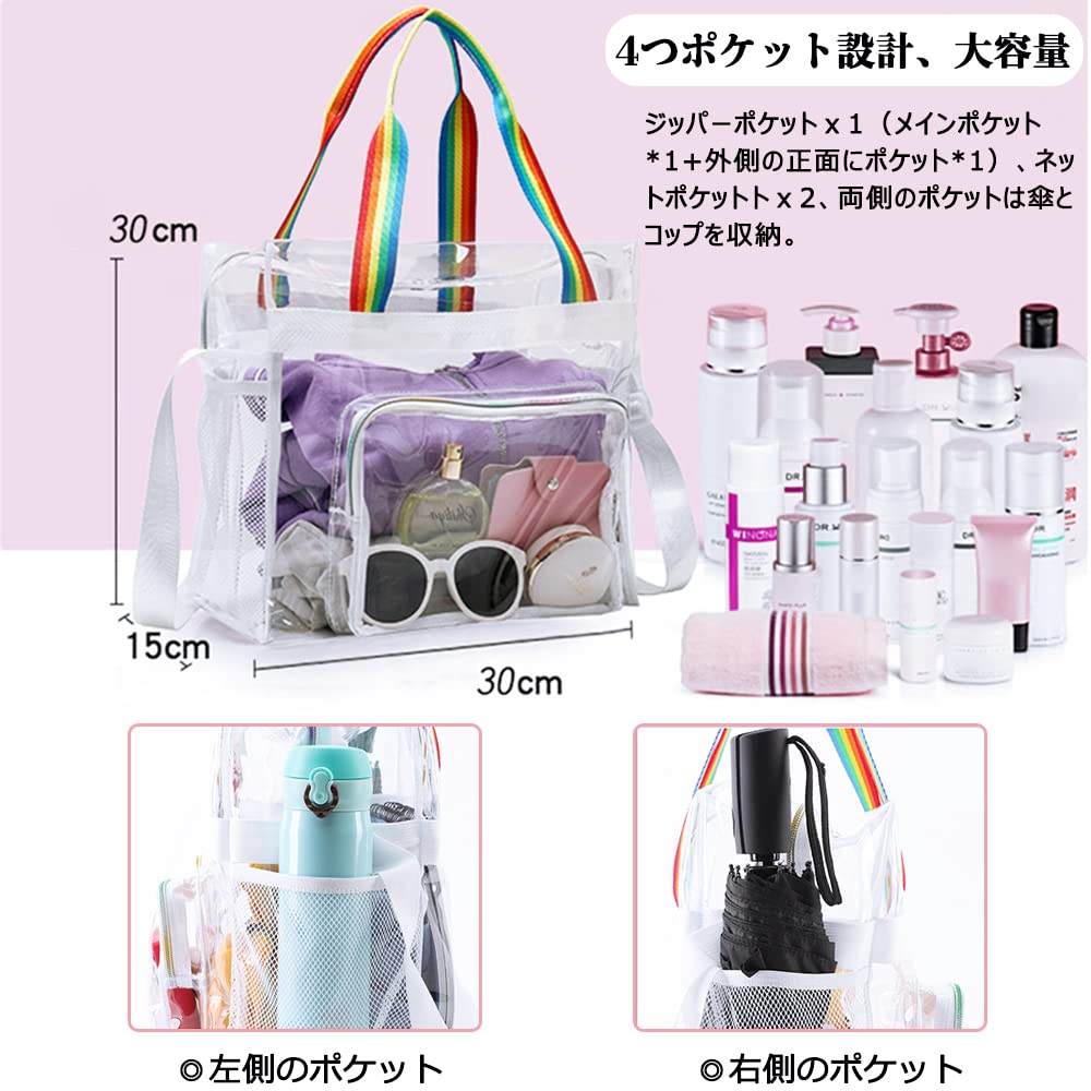 【商品仕様】:サイズ(約):縦30㎝×横30㎝×幅15㎝、重量:約350g。素材:PVC、ナイロン。透明のデザインなので、バッグの中身がひと目で確認できます。軽量で持ちやすく、レディースでもメンズでもOK!春夏秋冬、季節を問わずにハンドバッグとショルダーバッグとしてご使用いただけます。