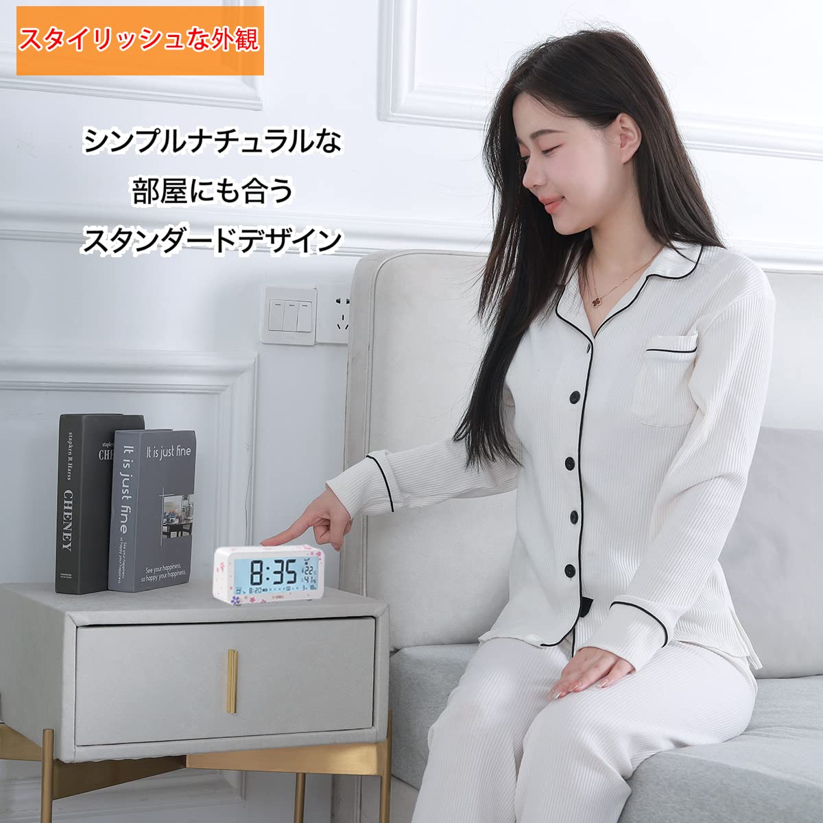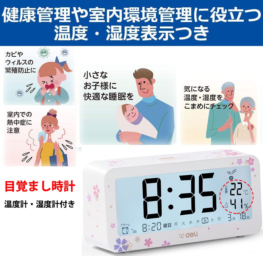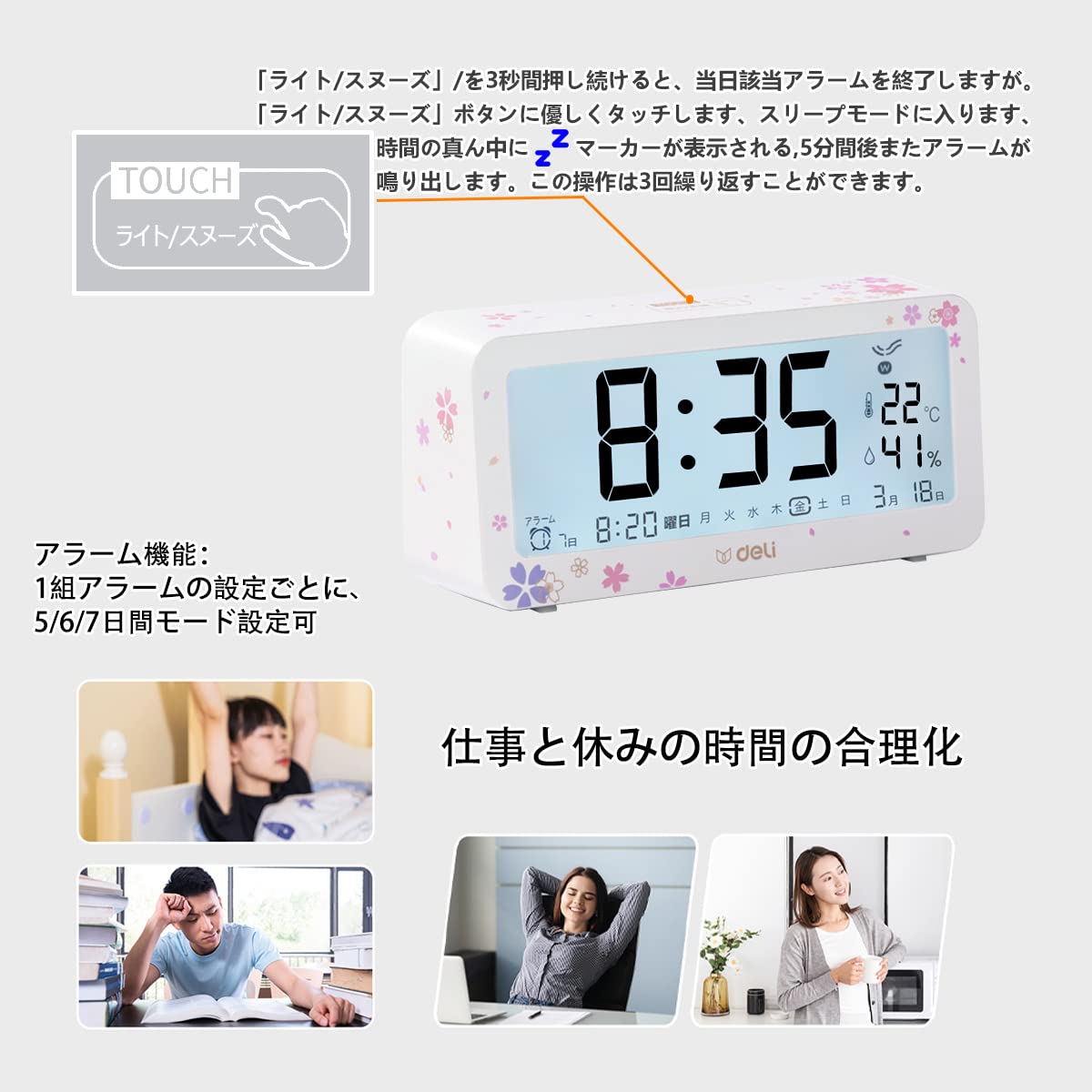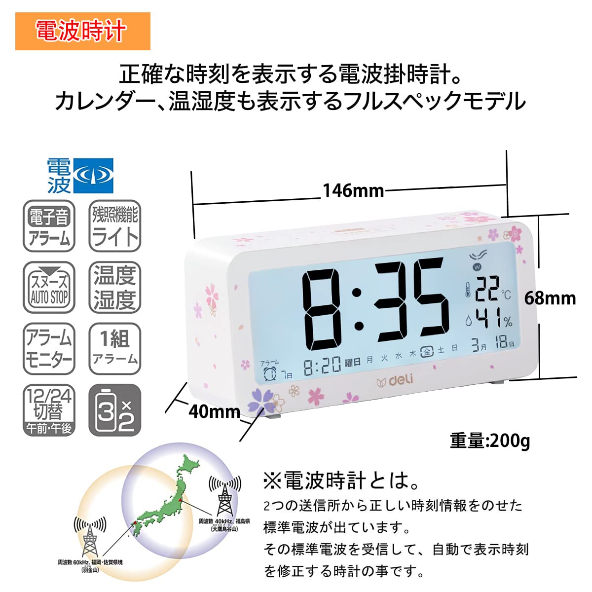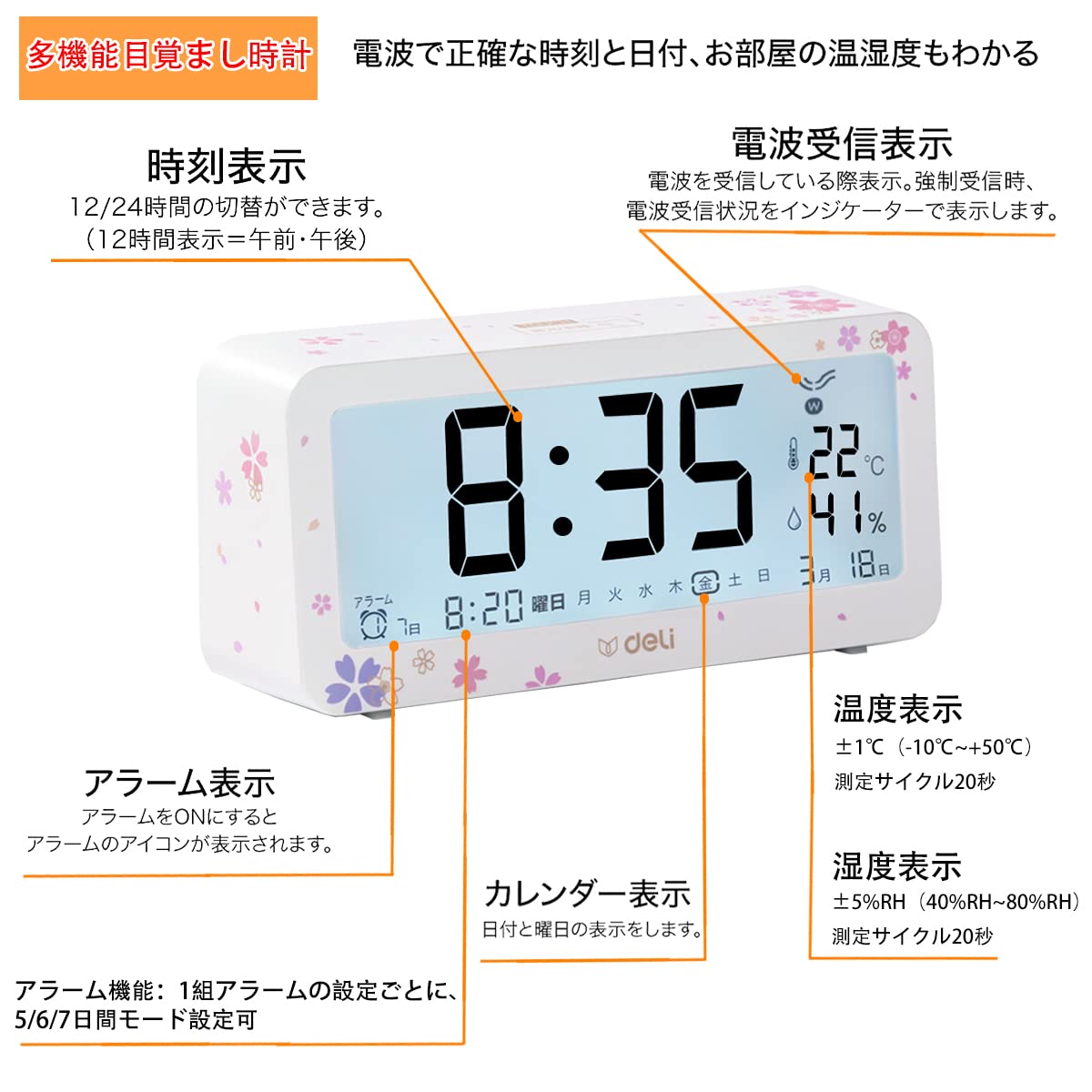 /Deli 目覚まし時計 電波時計 2年 桜の模様 文字も大きくてみやすい 乾電池式 画面が明る 温度計・湿度計付き 多機能デジタル時計 静音 スヌーズ機能 コンパクトでシンプル ファッショナブルな外観 簡単な操作で 置き時計(14.6cm桜の花 白)