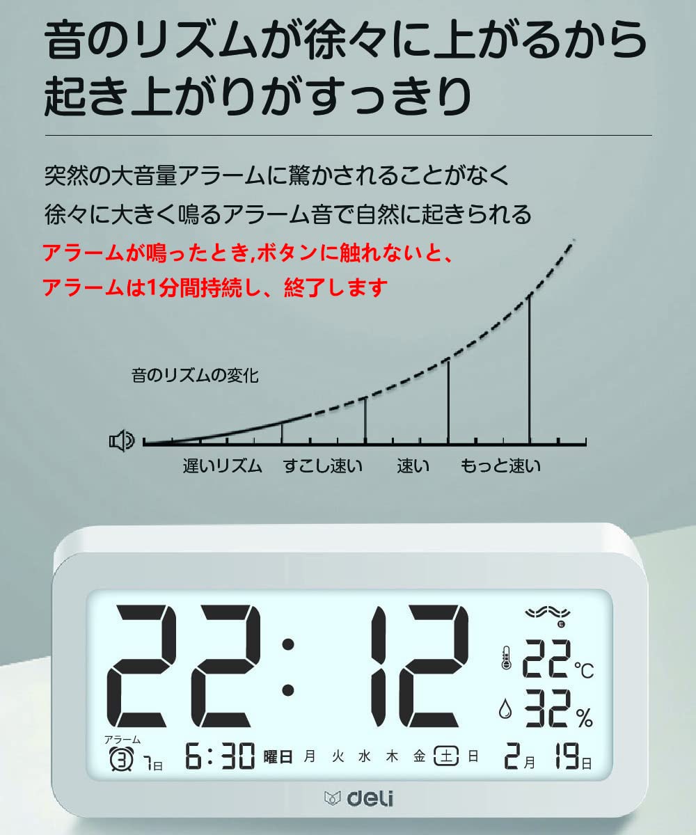 【目覚まし時計の音】滑らかに聞こえるのは、音のリズムがゆっくりと立ち上がるからです.突然の大音量のアラームに驚かされることなく、ゆっくりと鳴るアラーム音で自然に目が覚めます.アラームが鳴ったとき,ボタンに触れないと、アラームは1分間持続し、終了します