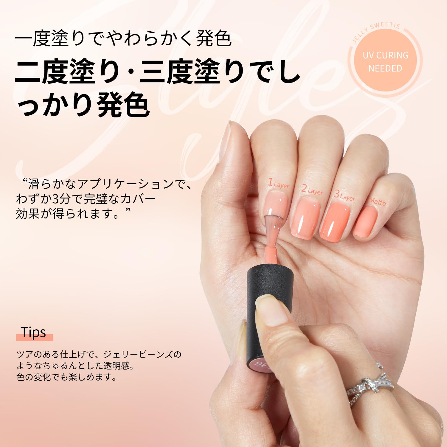 発色:一度塗りでやわらかく発色、二度塗りか三度塗りでしっかり発色。マットトップで仕上げれば、すりガラスのようなプロストカラーです。ツアのある仕上げで、ジェリービーンズのようなちゅるんとした透明感。色の変化でも楽しめます。キレイな発色で、気分に合わせて、お好みに組み合わせます