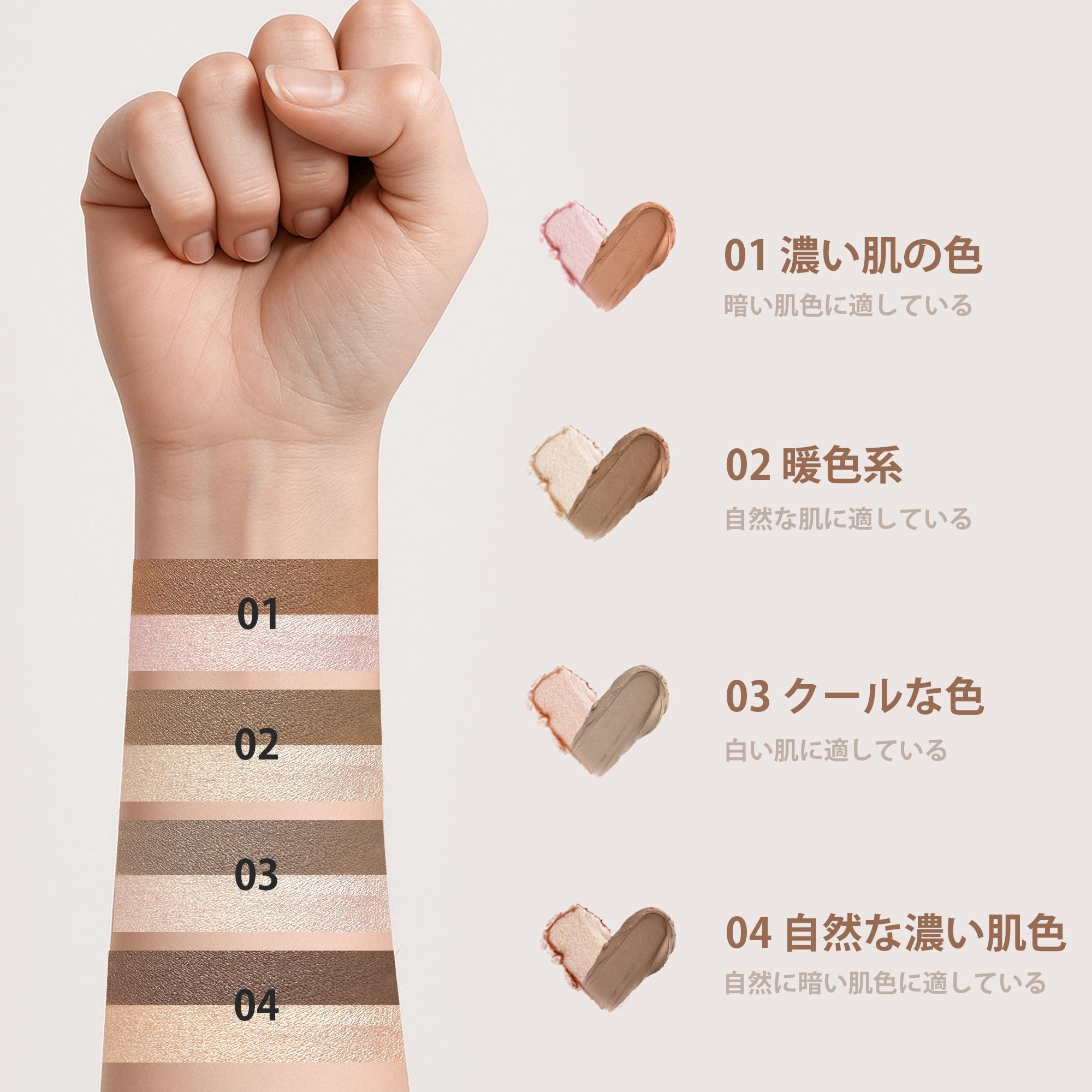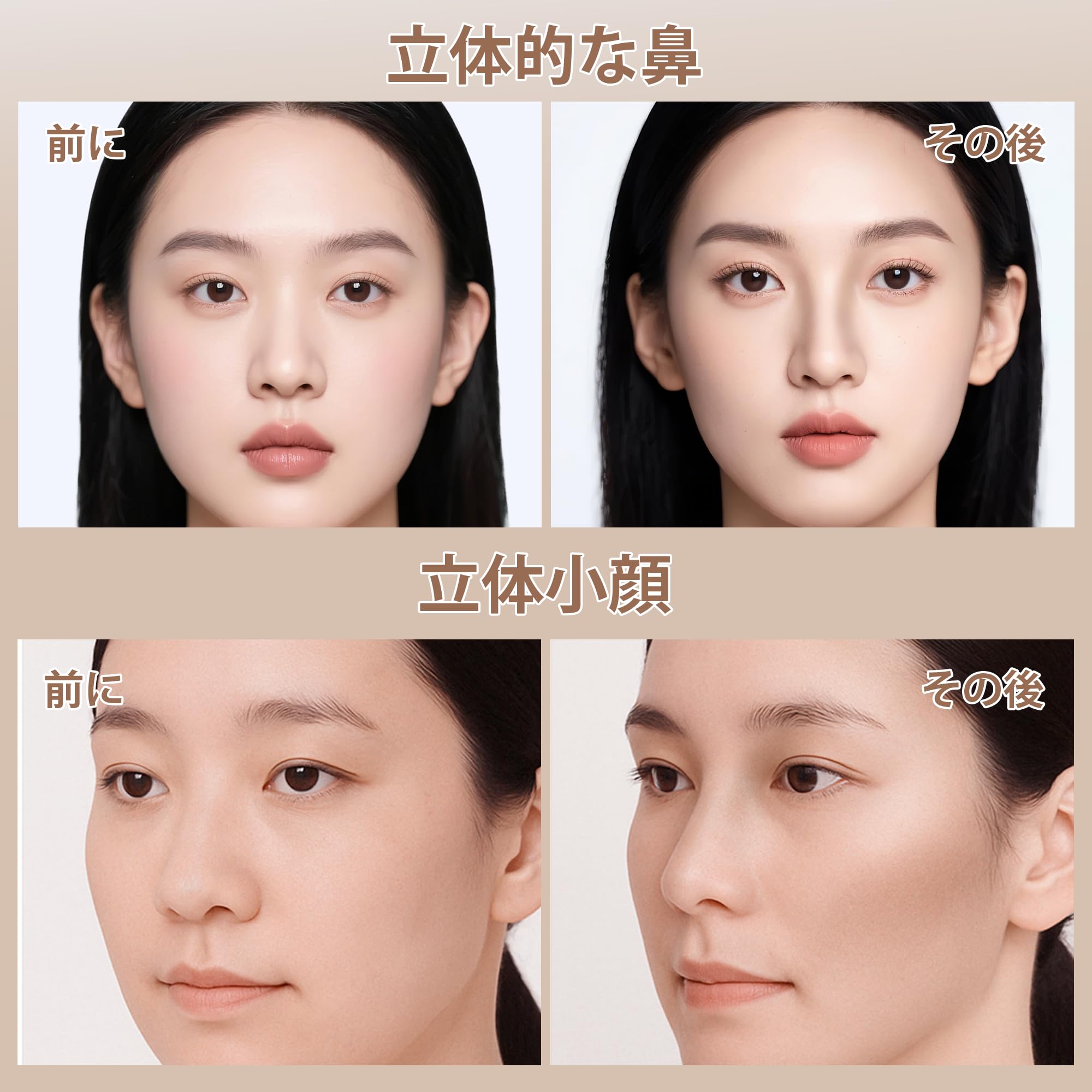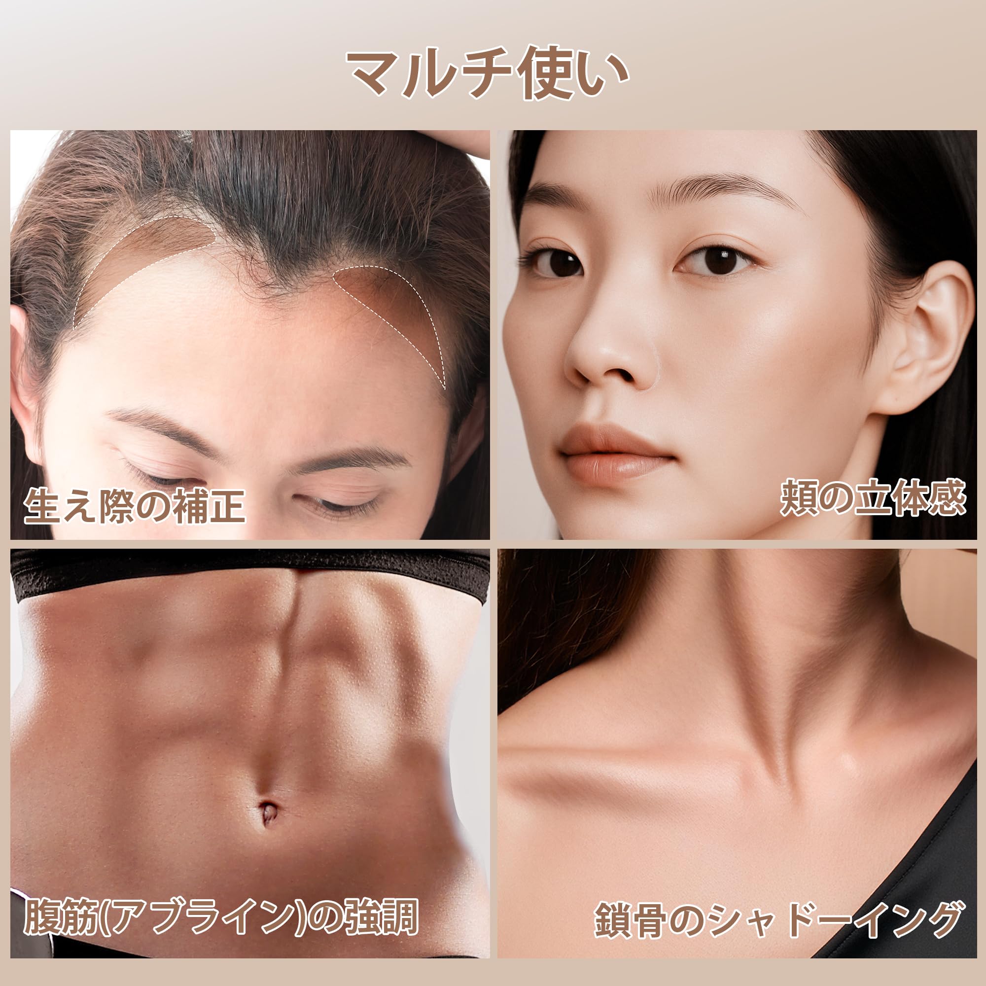 簡単な使用方法:ハイライトチップで鼻筋、額、顔のハイポイントに塗り、輪郭の毛先で髪の生え際や顔の側面に影をつけます。指やブラシで優しくブレンドすることで、マットで洗練されたルックが完成。