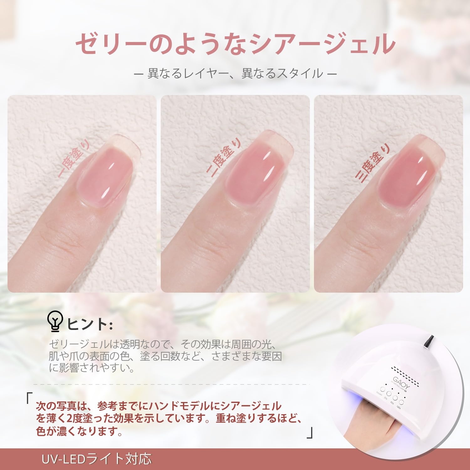 UV・LEDライト対応: UV・LEDライトを60秒間照射させて、ジェルを硬化させます。