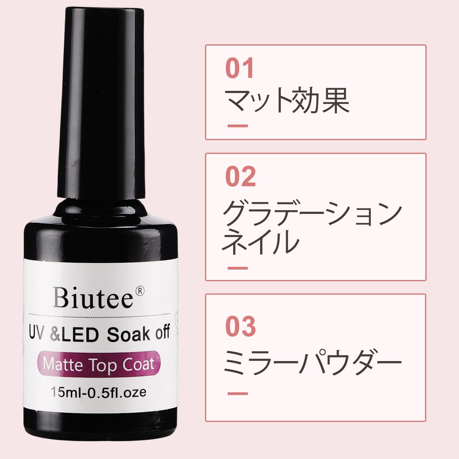【パッケージ内容】Biuteeマットトップコート*1本(15ml)。自宅でネイルアートを楽しむことができます!