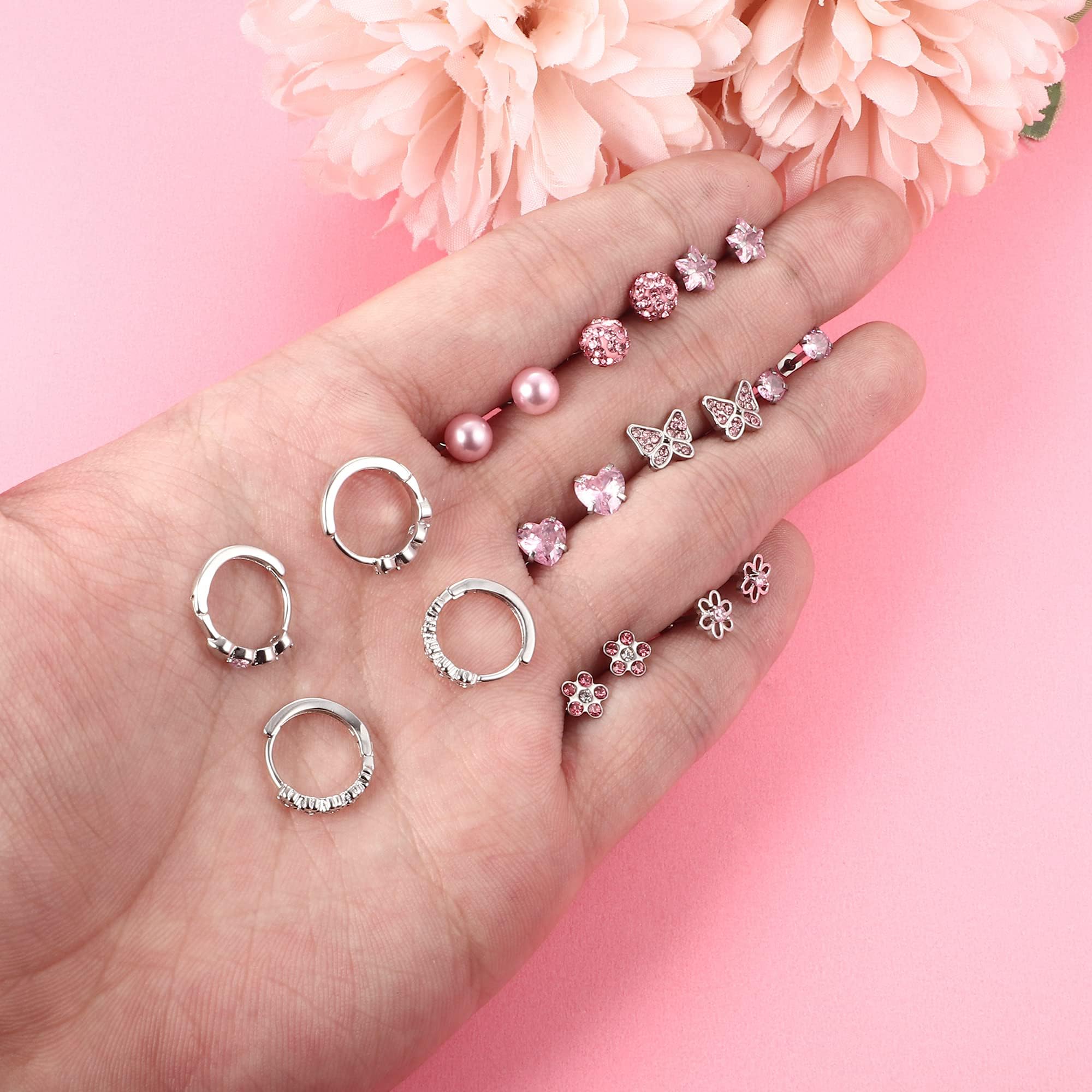 ??人気アイテム??ピアスは蝶、花、ハート、星、ボールのモチーフを使っております。8ペアスタッドピアスと2ペアフープピアスの組み合わせです。ジルコニアはピンクであり、鮮やかでキラキラと輝いています。美しい色合いがコーディネートのアクセントになります。