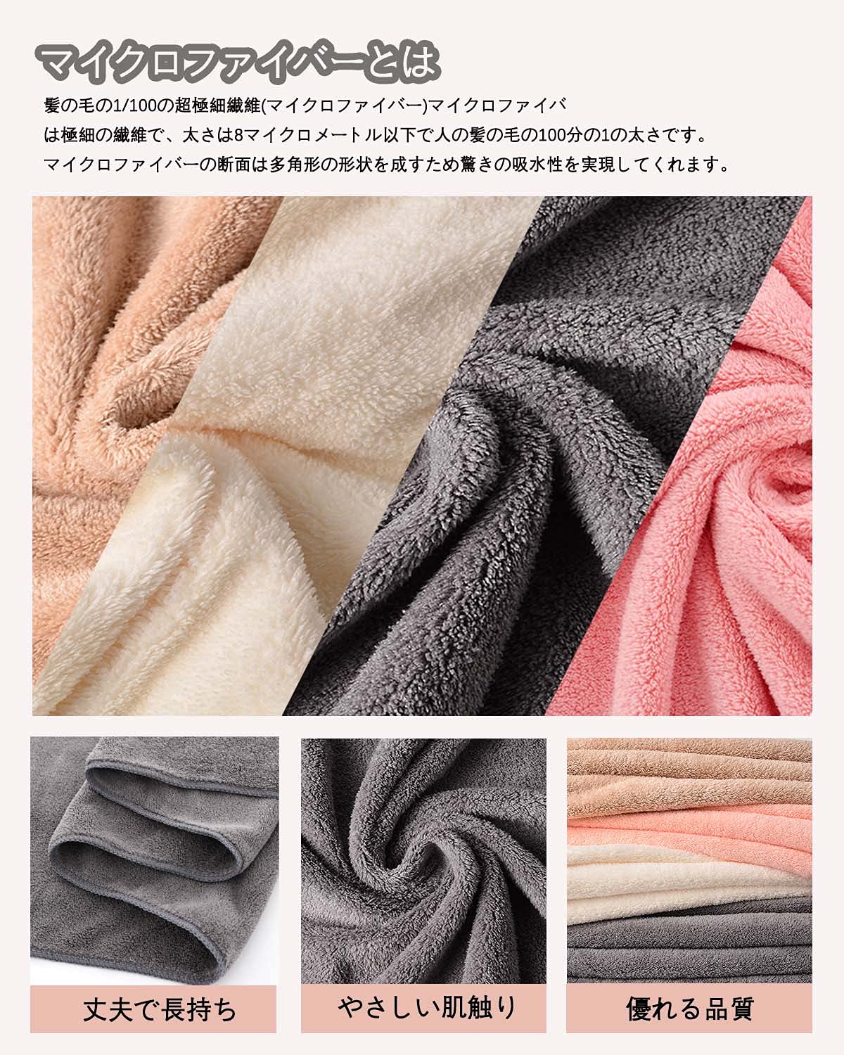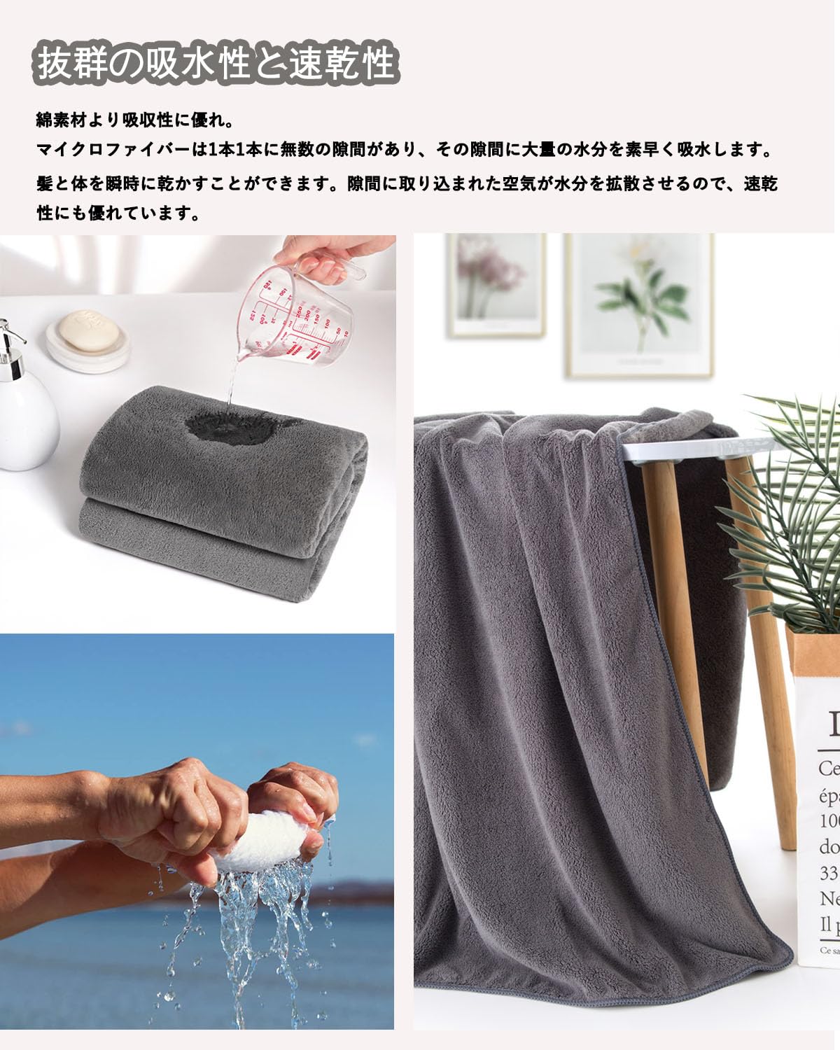 【抜群の吸水性と速乾性】綿の素材より吸水性が優れます。マイクロファイバー素材の表面は数えられない隙間があり、その隙間に大量の水分を素早い吸水できます。髪や肌にそっと当てるだけで水分が吸収される素材であり、また汚れも落としやすい特徴があります。隙間に取り込まれた空気が水分を拡散させるので、速乾性のポイントで、バスタオルの雑菌を抑え、健康を保つことができます。